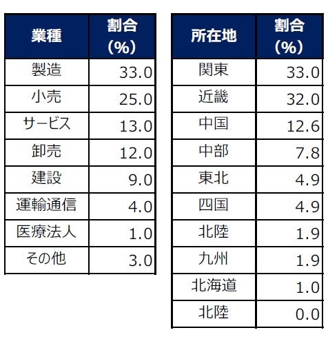 145件のうち確認できた業種をみると、「製造」が33.0%でトップ、「小売」が25.0%で続く。地域別では、「関東」が33.3%でトップ、「近畿」が32.0%で続く。年商別では、「1億~5億円未満」が38.7%でトップとなり、負債別でも「1億~5億円未満」が41.4%でトップ