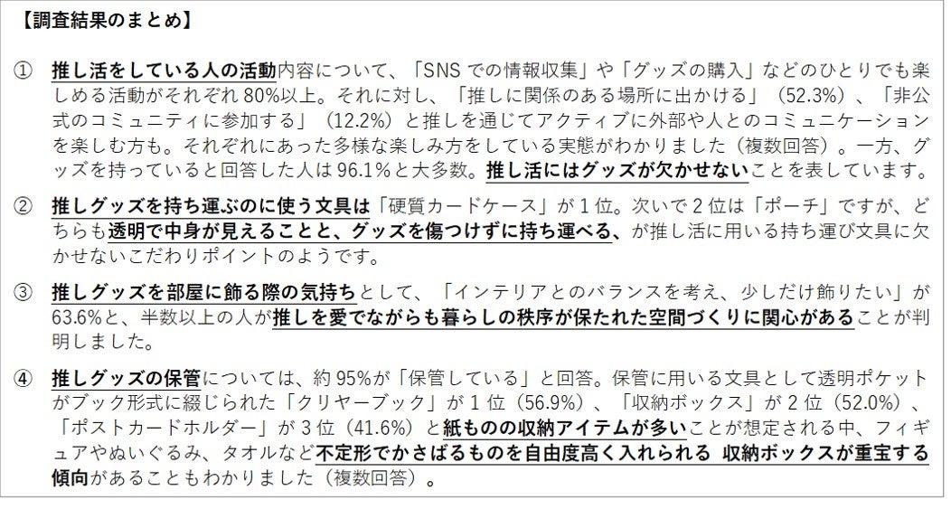 ④ 推しグッズの保管については、約95%が「保管している」と回答。保管に用いる文具として透明ポケットがブック形式に綴じられた「クリヤーブック」が1位(56.9%)、「収納ボックス」が2位(52.0%)、「ポストカードホルダー」が3位(41.6%)と紙ものの収納アイテムが多いことが想定される中、フィギュアやぬいぐるみ、タオルなど不定形でかさばるものを自由度高く入れられる 収納ボックスが重宝する傾向があることもわかりました(複数回答)。 |