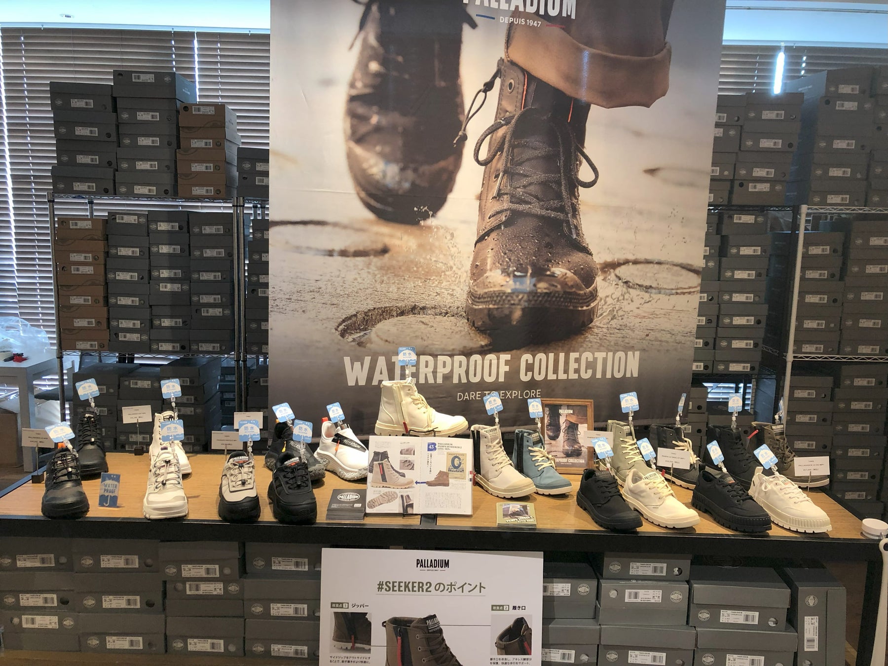 パラディウムは、フレンチミリタリーを起源とするブーツスニーカーブランド。航空機専用のタイヤメーカーとして1920年代にフランスで創業し、第二次世界大戦後、その技術を応用し、ラバーソールブーツの製造にスタート。日本では、フェスシーンやアウトドアでも活躍する防水ブーツで知られ、昨シーズンリニューアルした「SEEKER(シーカー)2」を始め、レトロスニーカーやカラフルキャンバスが注目アイテム。