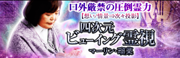 様々なTVや雑誌等で活躍する霊視能力者マーリン・瑠菜。彼女の類まれなる霊能力を集結させた【四次元ビューイング霊視】は現在に限らず、過去・未来の時間軸を超えて自在に投影し、あなたの運命、好きなあの人の想い、2人の恋未来を余すことなく見通します。望み通りの成功・結婚・仕事や恋愛成就を叶える異例の霊視鑑定をご体感ください。