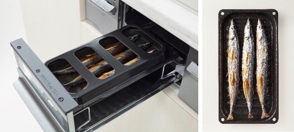 新発想のマルチグリルを採用し、魚を焼く以外にも、煮る、蒸す、ノンフライ、あたため直しなど多彩な調理が可能です。天板は水だけで汚れや焦げ付きが取れる親水アクアコートを施し、凹凸が少ないデザインとなっており、お手入れも簡単に行えます。