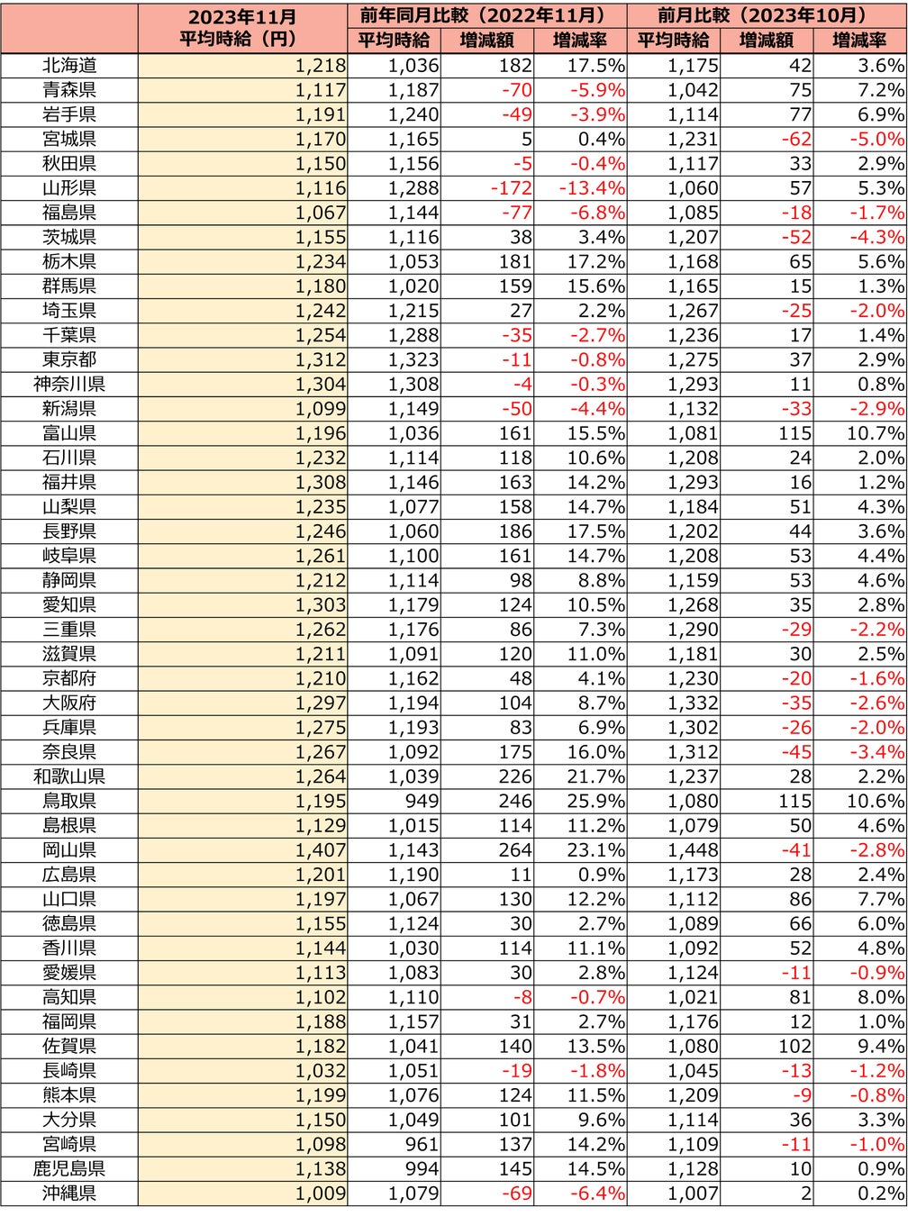 全国・前年同月比 時給上昇額TOP3(2023年11月度)