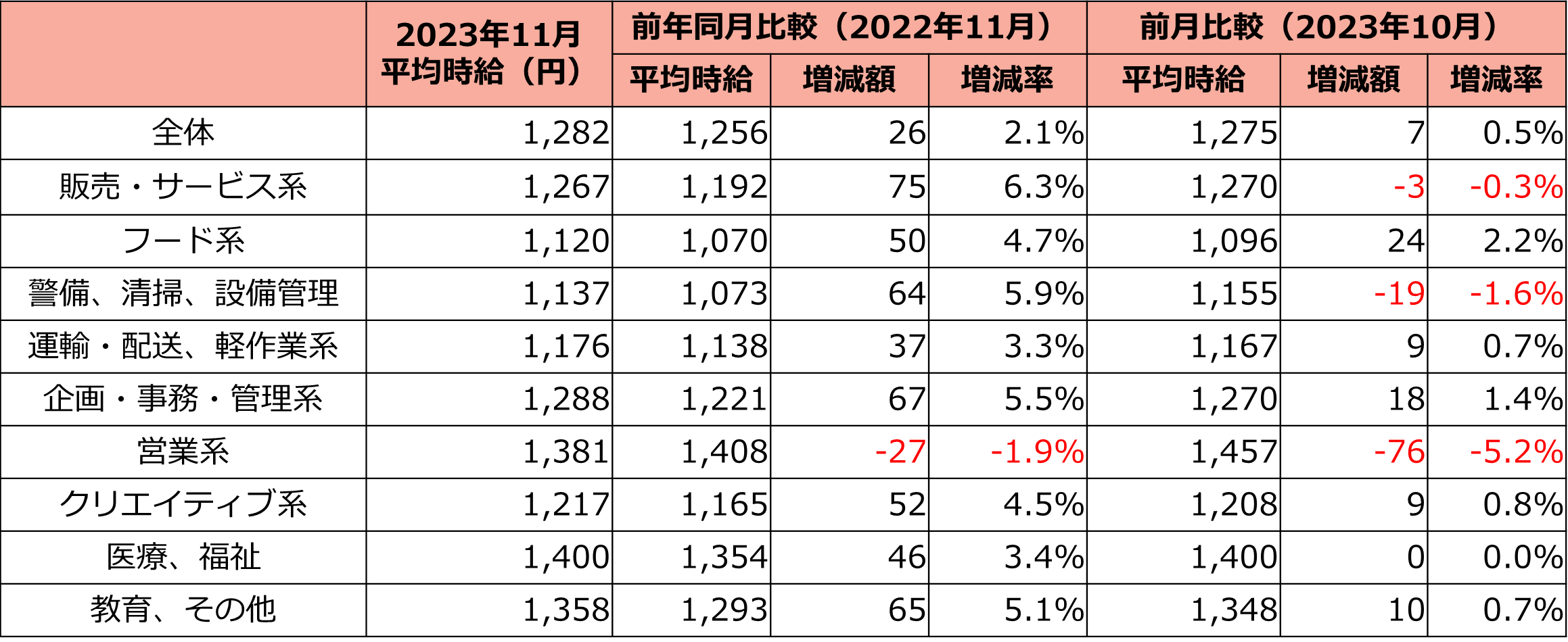 全国の11月度平均時給は1,282円。年末手当、深夜手当が上乗せされ、過去最高時給を更新。