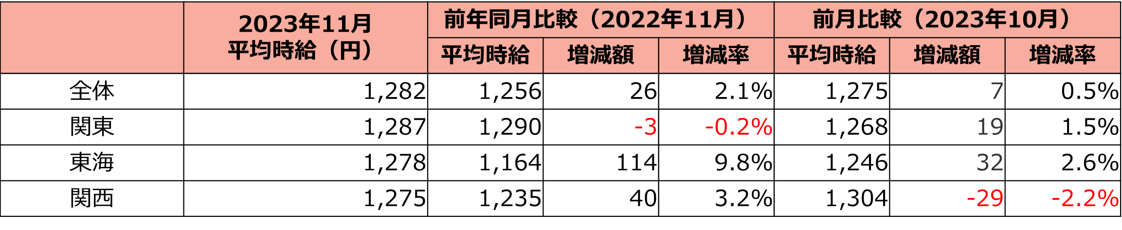 11月度のエリア別平均アルバイト時給は、東海・関西で前年同月比プラスに。