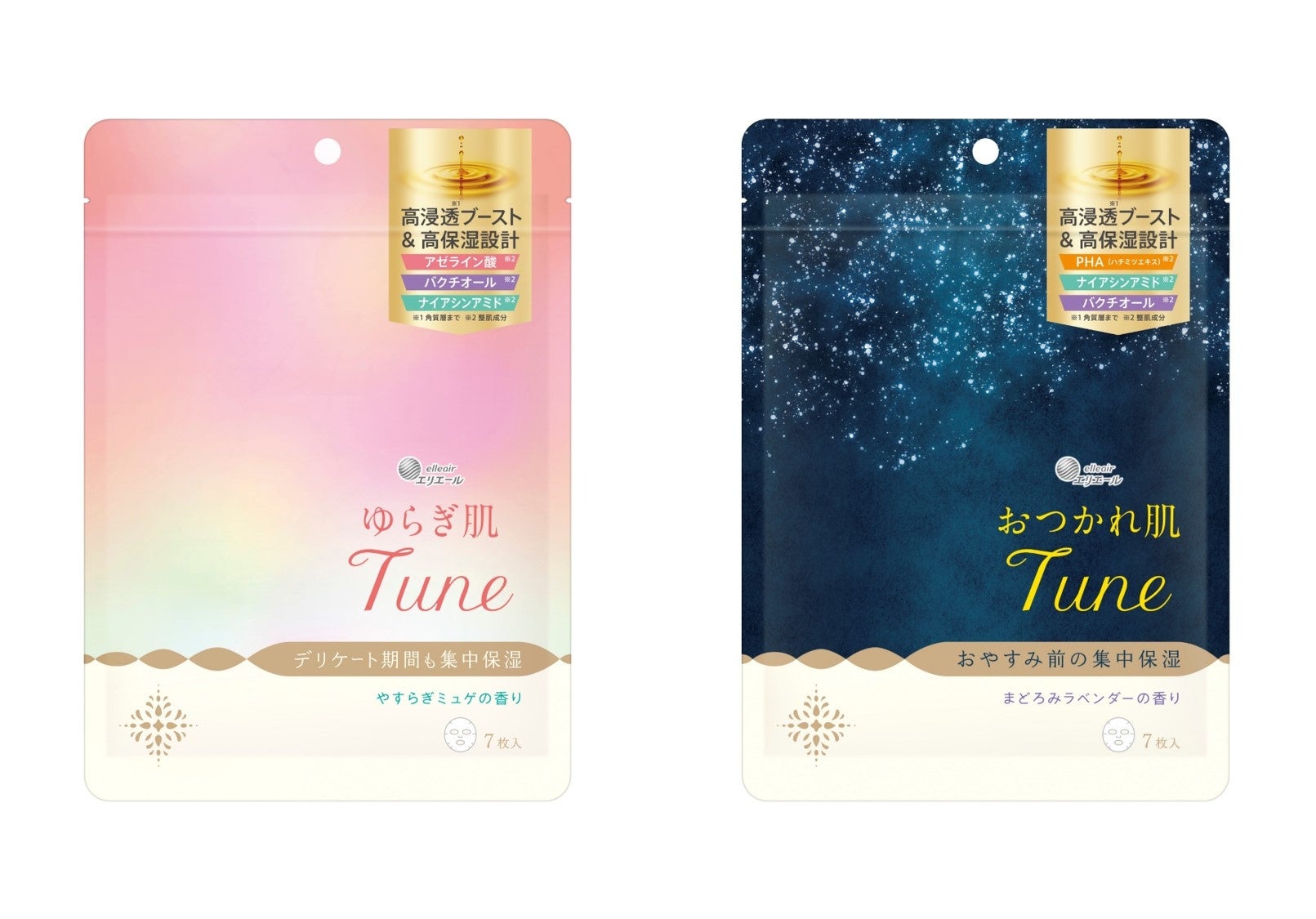 そこで、「エリエール」は、忙しい日々の中でも気軽に“気まぐれ”な肌を整えるだけではなく、使う方の日々変化するきもちにもよりそいたいという想いで「#気まぐれ肌チューニング」をキーワードに、肌ときもちのゆらぎが出やすい時期に特化したシートマスク『ゆらぎ肌Tune』『おつかれ肌Tune』を発売します。短い時間でも効率的なうるおいケアをしていただけるように保湿成分を独自設計し、肌がデリケートな時期や、疲れを感じる時期に嬉しい美容成分を配合。さらに、使用シーンに合わせた香りで、肌が低調な時に落ち込みがちなきもちにもよりそいます。