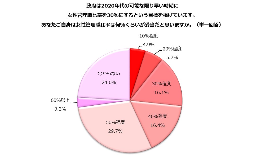 ・女性に限らず管理職を目指す人が少なくなっているような気がするため、比率にこだわるより男女全体で目指すべき人がめざせばよいと思う(50代:公務員/団体職員)