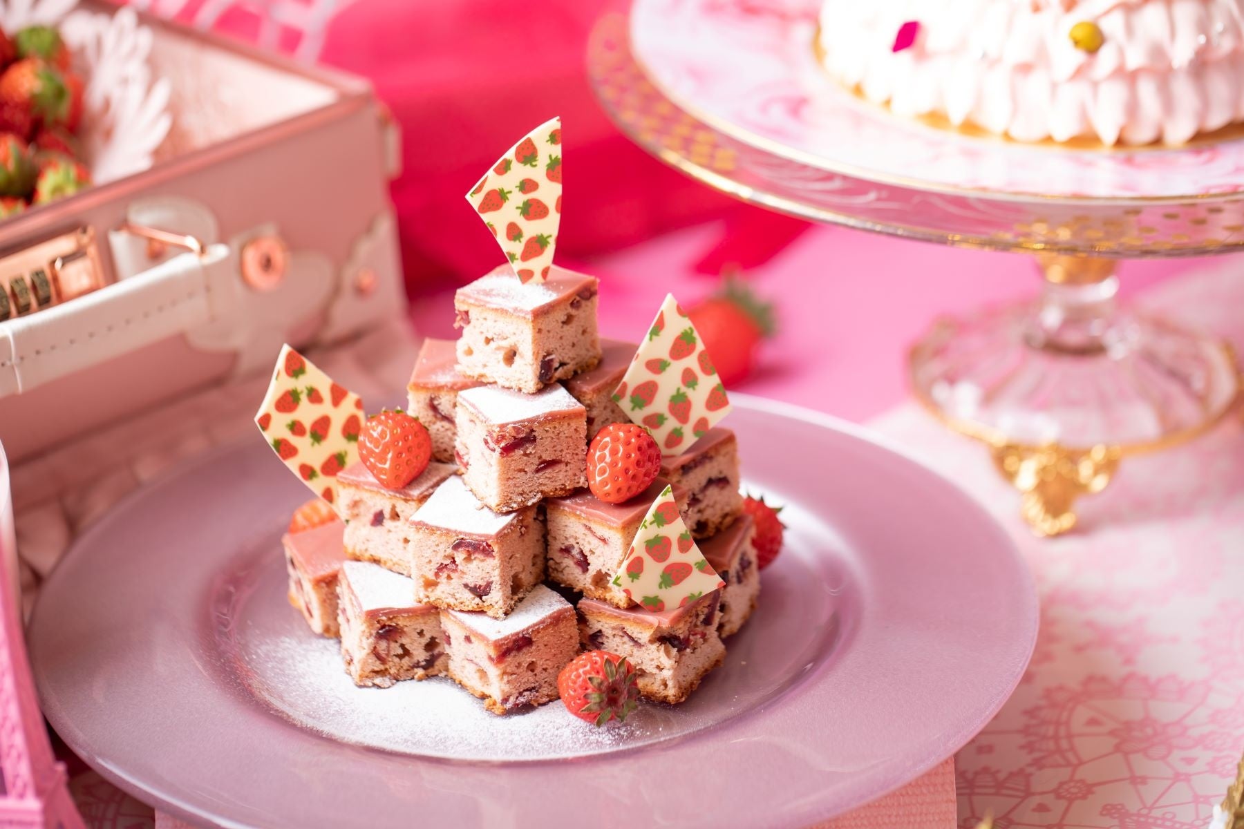 ■スイーツ(全18種類):ドレスドールショートケーキ/いちごレモンのタルト/ストロベリーパイ/カヌレタワー/ルビ―ショコラとベリオットムース/ライチとストロベリーのムース/いちごのガトーオペラ/いちごとヨーグルトのパンナコッタ/いちごプリン/チョコレートとチェリーのベリーヌ/いちごとピスタチオのベリーヌ/いちごのマスカルポーネムース/スティックワッフル/いちごチョコレートパウンドケーキ/いちごのクレープシュゼット/いちごマカロン/いちごと白ワインゼリー/SDGsフレッシュいちご食べ放題(形が規格外のため通常は提供されないもの)