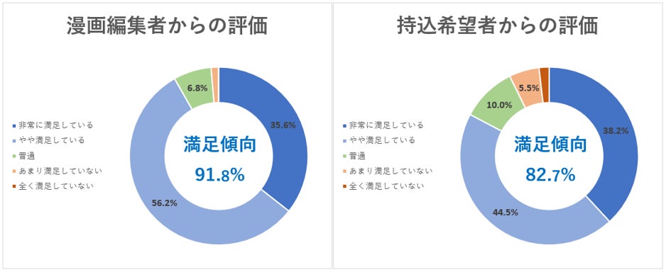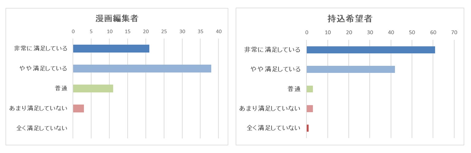 漫画編集者から「非常に満足している」「やや満足している」は合計91.8%、持込希望者の「非常に満足している」「やや満足している」は合計82.7%という結果になりました。