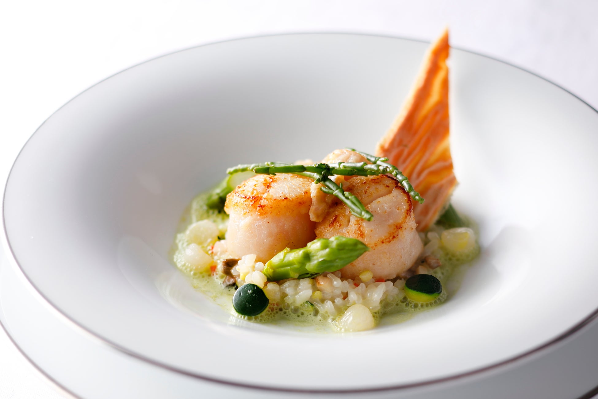 青森県平内町から白砂活貝組の殻付き帆立貝のポワレ オマールエビのスープ仕立て