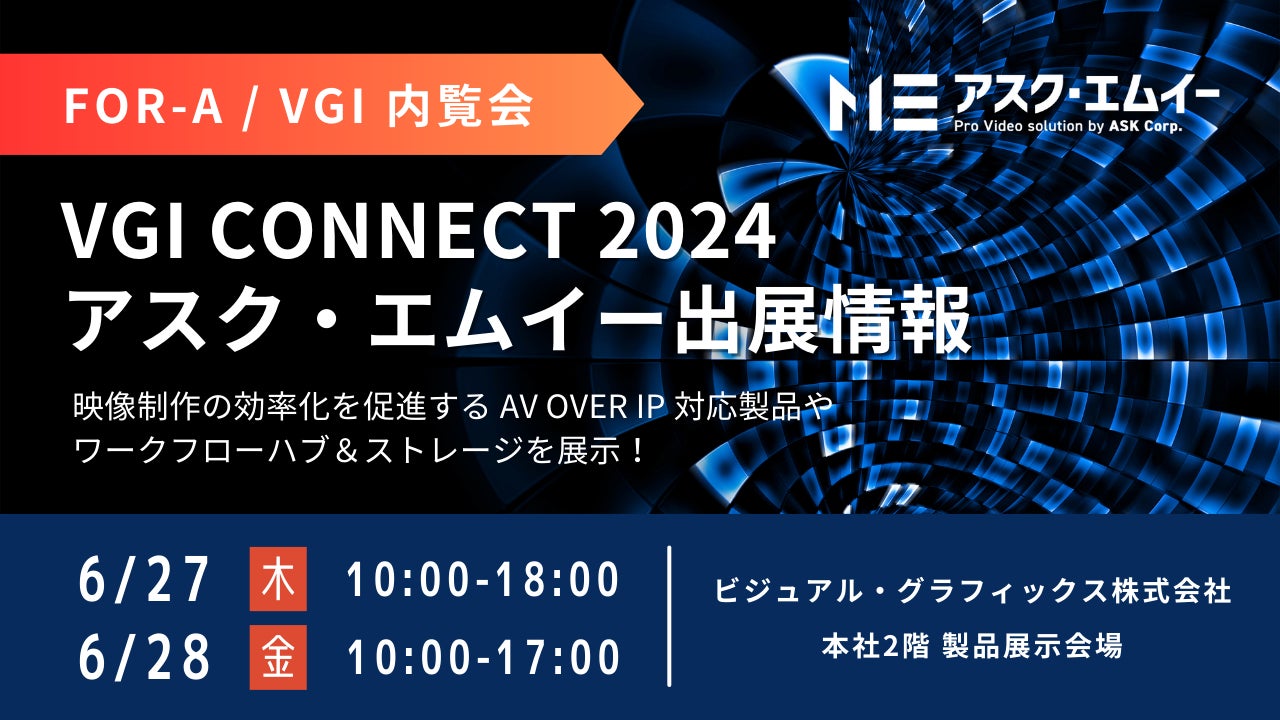 株式会社アスク (本社 : 東京都千代田区) は、2024 年 6 月 27 日 (木) 〜 28 日 (金) にビジュアル・グラフィックス株式会社 (VGI) が主催する【 VGI CONNECT 2024 】に出展します。アスク M&E事業部 (アスク・エムイー) の展示コーナーでは、今年 4 月の NAB Show でアップデートされた最新製品や、AV over IP 技術でライブ配信 / 映像伝送を効率化させるソリューションを一挙にご紹介します。
