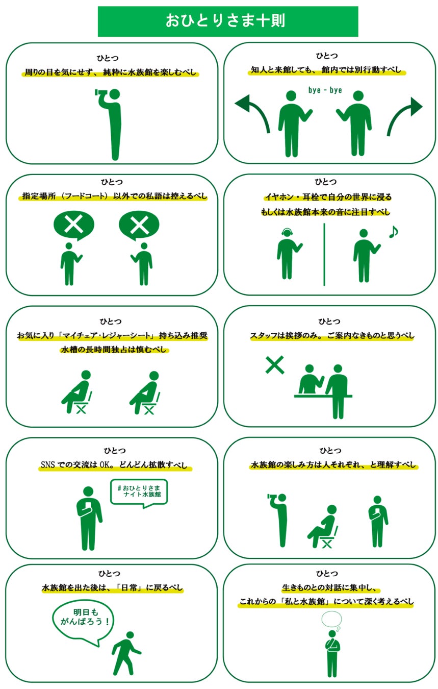 このイベントを心ゆくまでお楽しみいただけるよう設定したルール「おひとりさま十則」や、キャンドル型ライトの装飾などの限定コンテンツにより、「周りの目を気にせずに、ひとりで水族館を楽しめる」と大変好評いただき、今回で14回目の開催です。