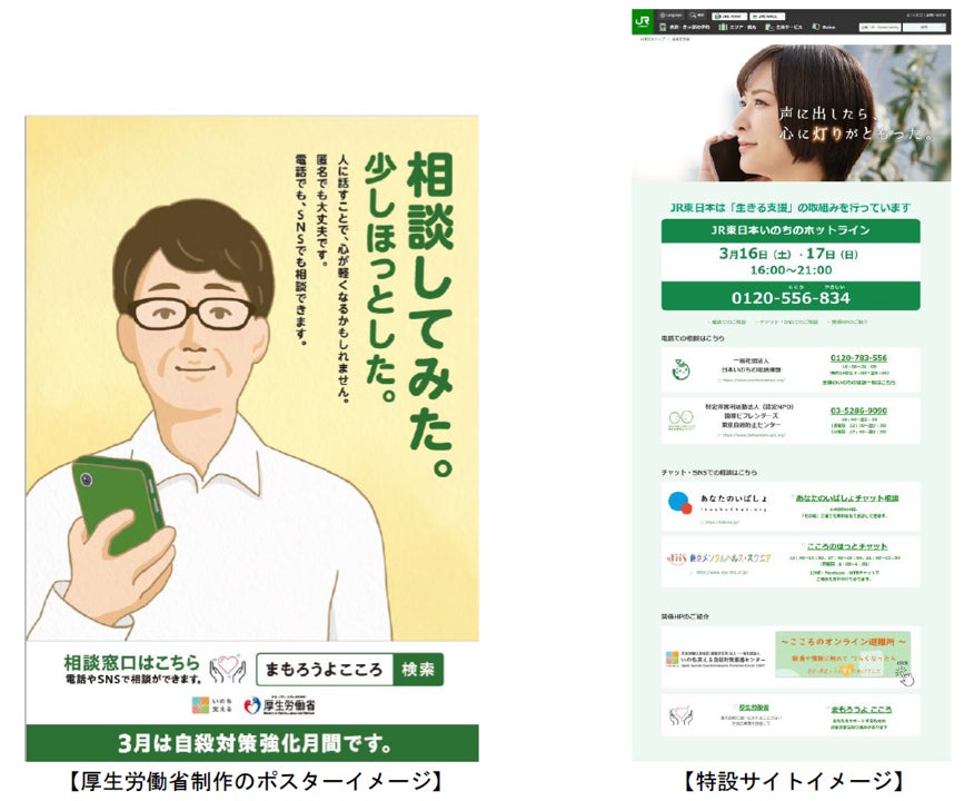 JR東日本では、政府が3月を「自殺対策強化月間」と定めて自殺対策の啓発活動などを実施することに合わせ、「JR東日本♥生きる支援」の取り組みとして、自殺に追い込まれようとしている人が生きることを選択できるように各種啓発活動を実施します。 |