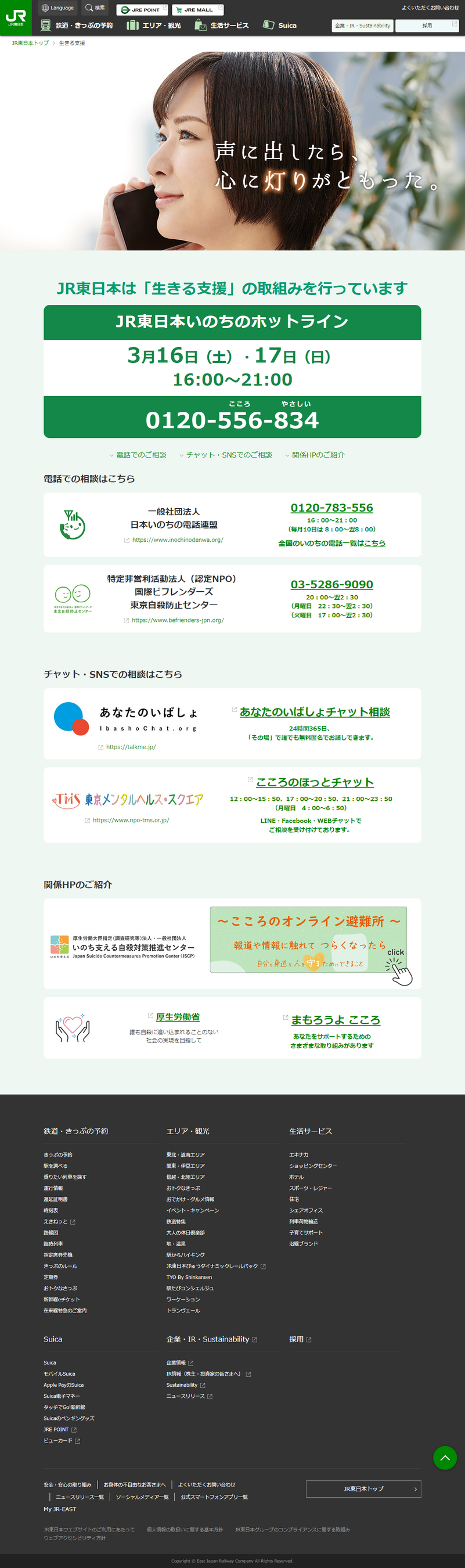 「いのちのホットライン」開設の告知および「JR東日本♥生きる支援」の取り組みに協賛いただいている各団体の相談窓口を掲載します。