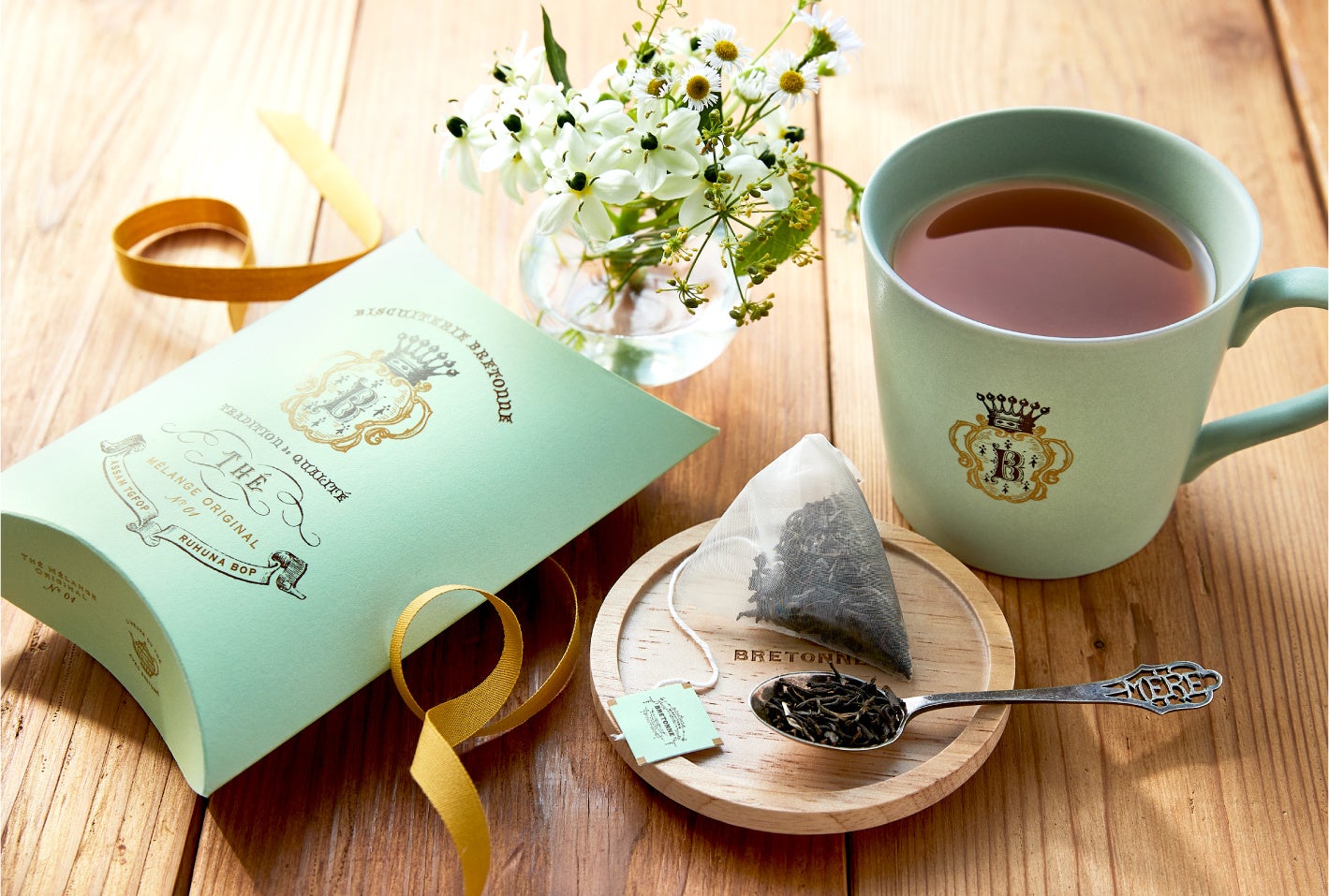 紅茶は、芳醇なバターの風味や素材の味を生かしたブルトンヌの焼き菓子と引き立て合うよう、紅茶鑑定士と一緒に作り上げたオリジナルブレンドの紅茶です。香り高いアッサムオレンジペコーのセカンドフラッシュをベースに、セイロンローグロウン(スリランカ産 低産地茶)のルフナを合わせてコク味と奥行きを加えており、ストレートでは上品な香りを、ミルクティーでは柔らかく深いコクをお楽しみいただける、こだわりの紅茶です。