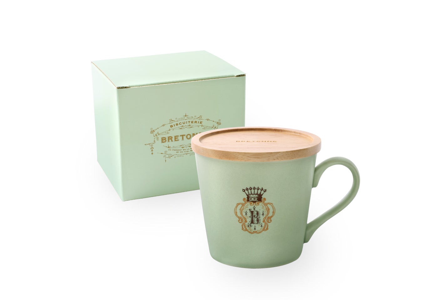 マグカップは、岐阜県多治見市の工房で一つ一つ作っていただいた上質な多治見焼のマグカップです。マットな質感の落ち着いたブルトンヌグリーンにロゴをあしらっています。ブルトンヌのロゴの焼印が入った木製フタがセットになっており、飲み物の保護や紅茶の蒸らし用のフタとしてはもちろん、コースターとして、またクッキーやフィナンシェなどの焼き菓子をのせるプレートとしてもお使いいただけます。