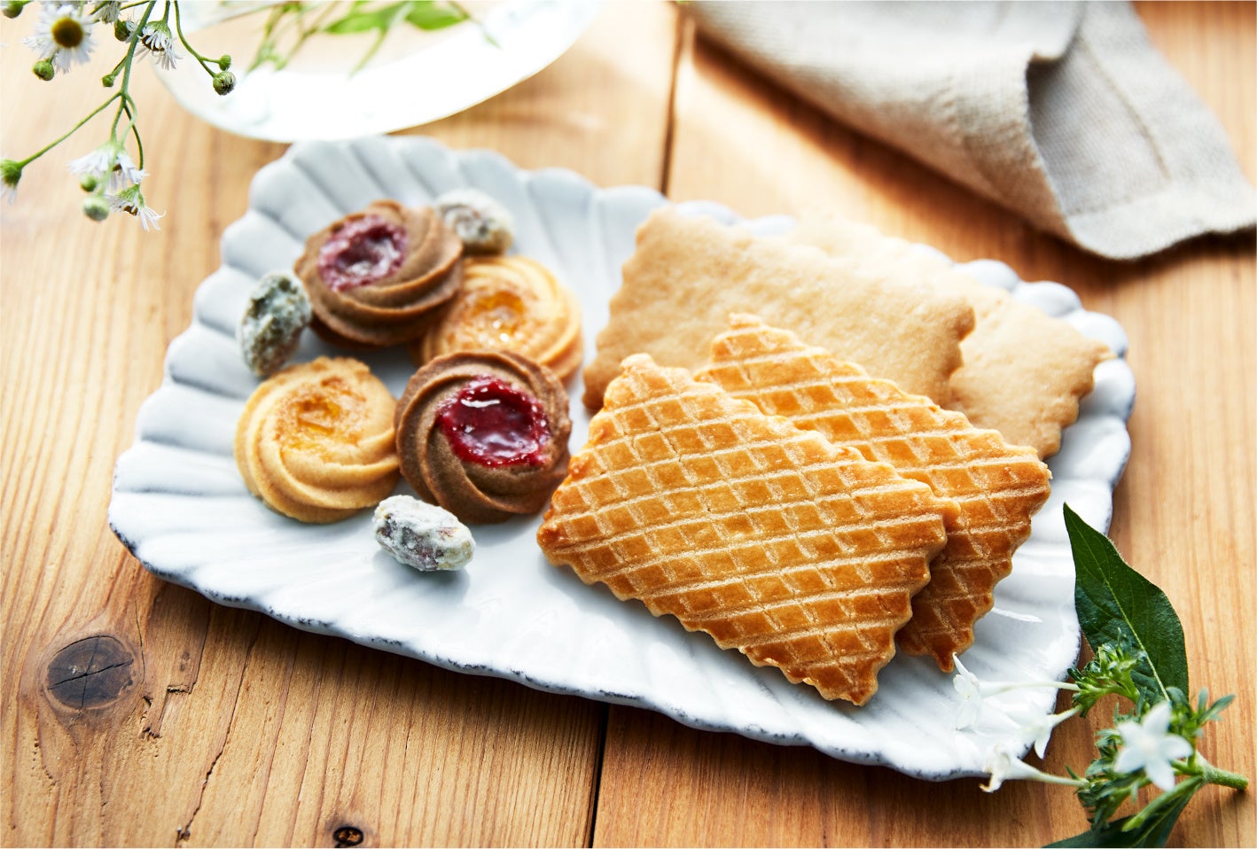 アニバーサリーらしく華やかなデザインの缶の中に、コンフィチュールをしぼったお花のような 2 種のサブレ「紅茶・フレーズ」「アプリコット」と、ゲランドの塩でアクセントを添えた糖衣がけしたピスタチオのお菓子「プラリーヌ・オ・ピスターシュ」、さらに、毎年アニバーサリーで店頭限定でお出ししている大人気の焼き立て商品「サブレ・ブルトンヌ」を味わいはそのままに、お茶菓子として食べやすいサイズ・形に変えて焼き上げた「サブレ・ブルトンヌ レクタングル」、素朴ながらも香ばしく味わい深い「バニラ・アマンド」など、バラエティ豊かな 5 種の限定の美味しさを詰めました。
