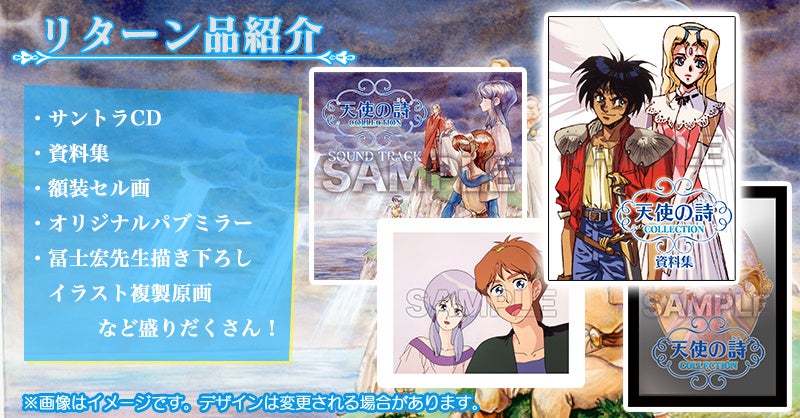 「天使の詩 復活応援プロジェクト」として開始したクラウドファンディングでは、Nintendo Switch用ゲームソフト「天使の詩 COLLECTION」のDLコードの他、名曲BGMのサントラCD、世界観を活かした資料集などのオリジナルグッズ、そして1作目のキャラクターデザイン冨士宏先生協力の下、この機会でしか入手できないリターン品を用意いたしましたので、多くの皆様のご支援をお待ちしております!