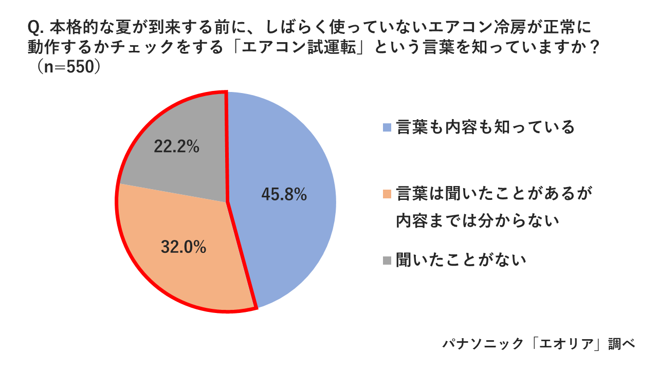 「『エアコン試運転』という言葉を知っていますか?」という質問では、「言葉も内容も知っている」と答えた方が45.8%だった一方、「言葉は聞いたことがあるが内容までは分からない」(32%)、「聞いたことがない」(22.2%)と、正しく理解していない方が54.2%と過半数を超える結果となりました。
