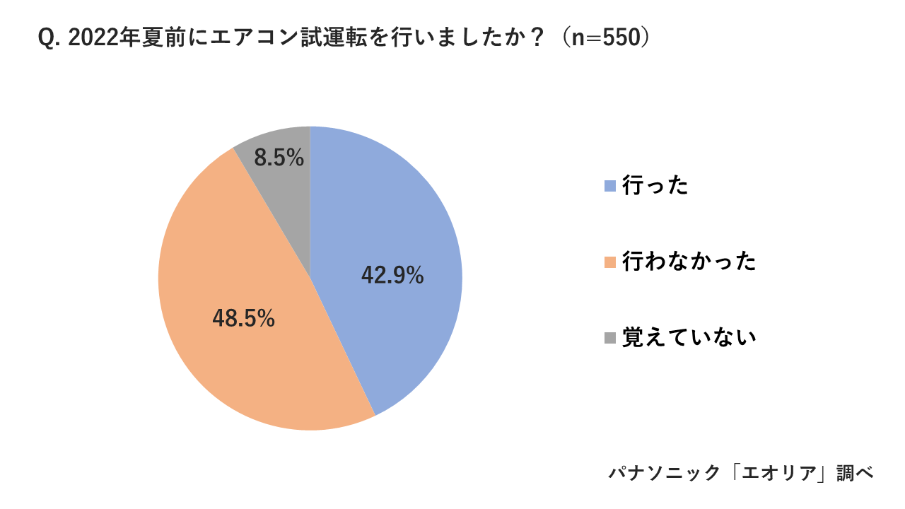 続いて、「2022年夏前にエアコン試運転を行いましたか」という質問では、42.9%が「行った」、48.5%が「行わなかった」という結果に。昨年行った「2021年夏前の試運転状況」は、53.6%が「行った」、46.4%が「行わなかった」と回答していたことから、試運転を行った方が前年比で約10%減少したことになります。