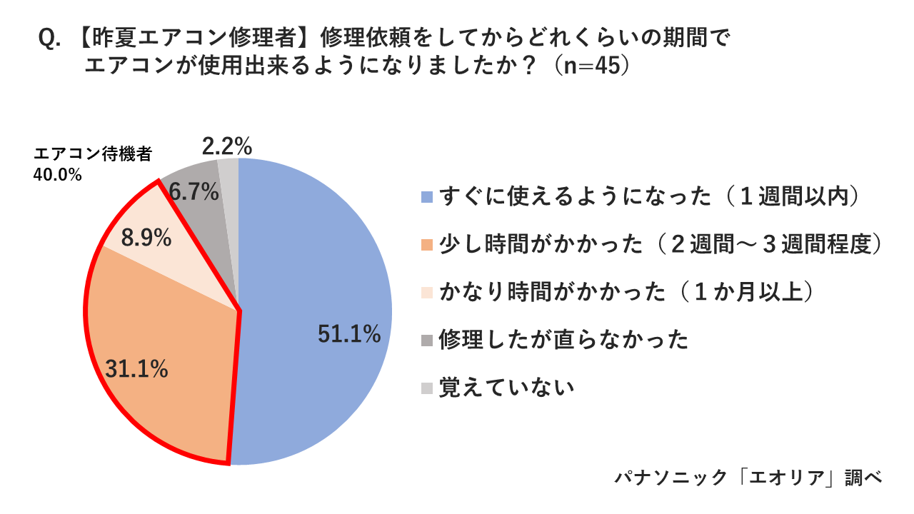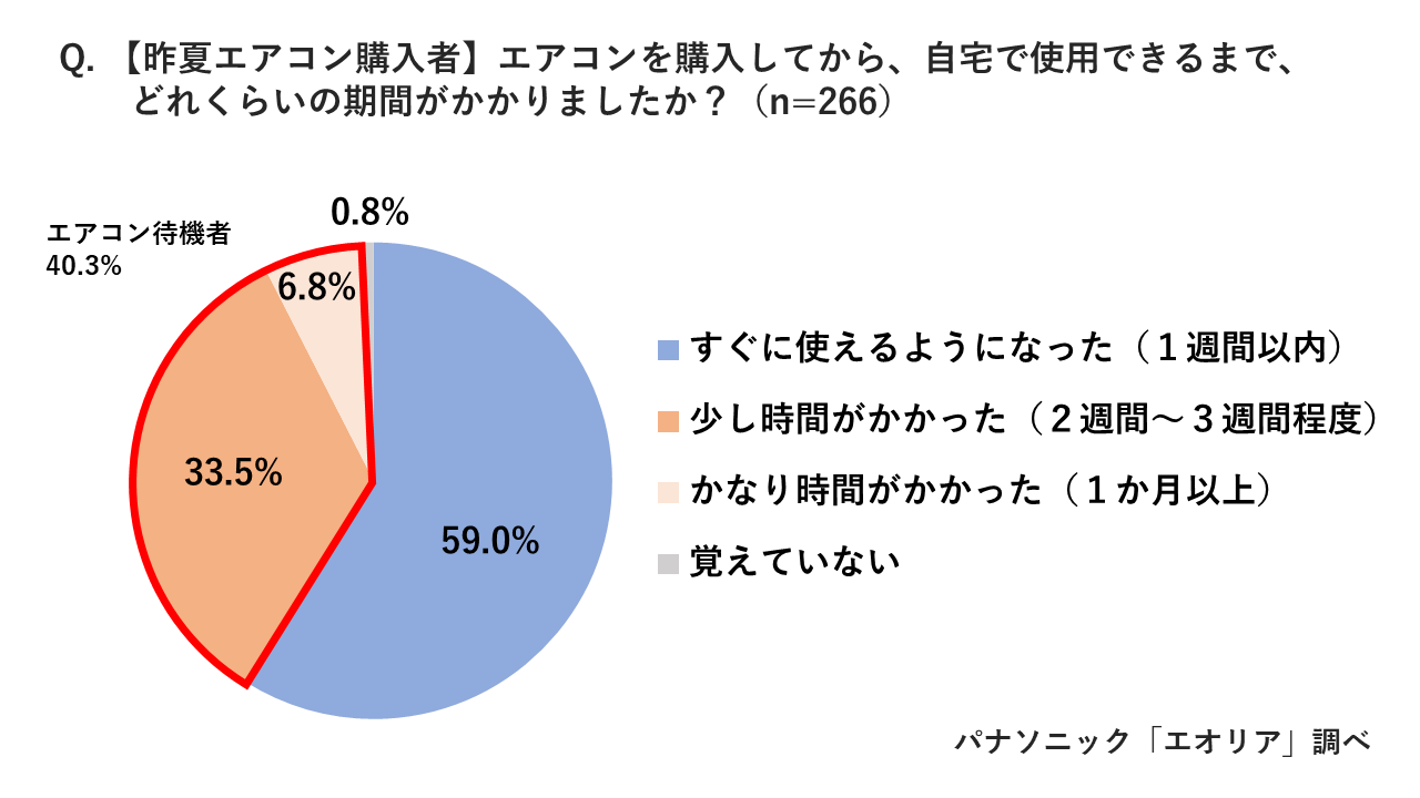昨年エアコンを購入、または修理した人がエアコンを使用できるようになるまでの期間を調べたところ、夏時期(6~8月)のタイミングでエアコンを購入・修理した人、どちらも約4割(購入者:40.3%、修理者:40%)が発注から使用まで2週間以上待たされる『エアコン待機者』であったことが明らかになりました。