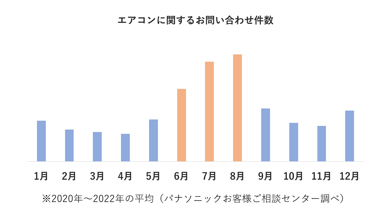 試運転を行ったタイミングについては、6月が最も多いという結果に。パナソニックお客様ご相談センターに寄せられるエアコンに関する相談については、例年7月~8月にお問い合わせが集中しており、過去3年(2020年~2022年)のお問い合わせ平均件数では、7月~8月のピーク時は4月の3.5倍~4倍近くにお問い合わせが急増しています。
