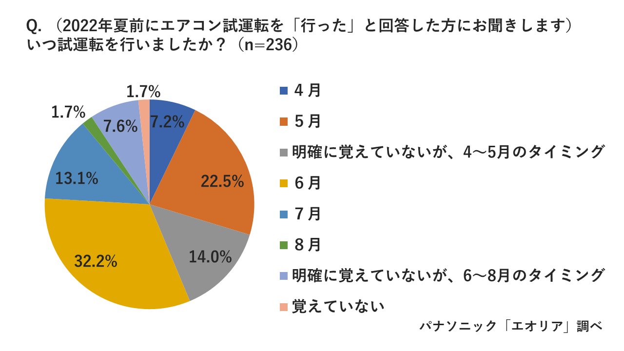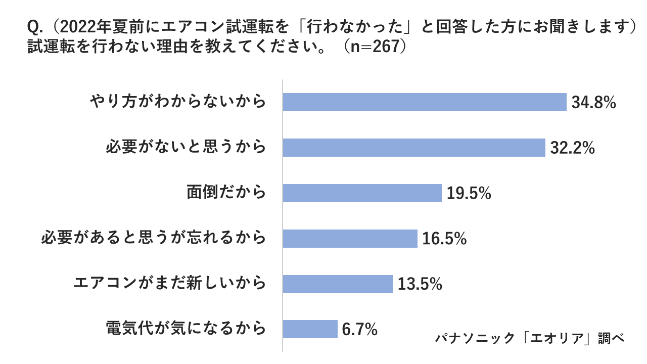 試運転を行わない理由としては、「やり方がわからないから」が最多で34.8%、「必要がないと思うから」が32.2%という結果に。しかし、『エアコン待機者』とならないために、購入時期に関わらず早めの試運転は必要不可欠です。
