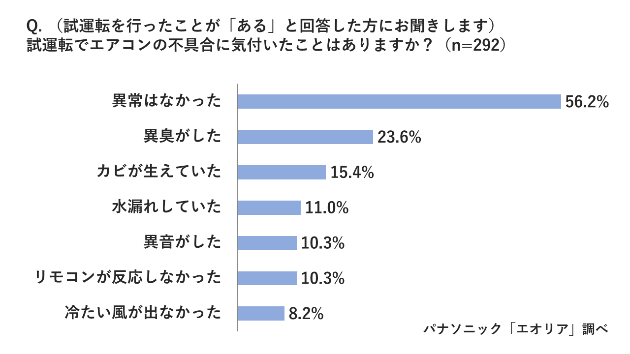 「これまでに試運転を行ったことはありますか?」という質問では、53.1%の方が「ある」、46.9%の方が「ない」と回答しました。試運転経験者に試運転でエアコンの不具合に気付いた経験を聞いたところ、約半数が試運転で何かしらの異常を発見していたことがわかりました。多かった異常は「異臭がした」(23.6%)、「カビが生えていた」(15.4%)、水漏れしていた(11%)という結果に。