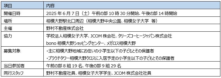 本イベントは相模原市との包括連携協定に基づくエリアマネジメント活動の一環で、地域の教育機関である学校法人相模女子大学(以下「相模女子大学」)などと協力し、主に地域にお住いの子どもたちと新築分譲マンション「プラウドタワー相模大野クロス※1(以下「本物件」)」にご入居予定の子どもたち、その保護者の方に、街の魅力を体験的に学び、地域とのつながりを深める機会※2 として取り組みました。