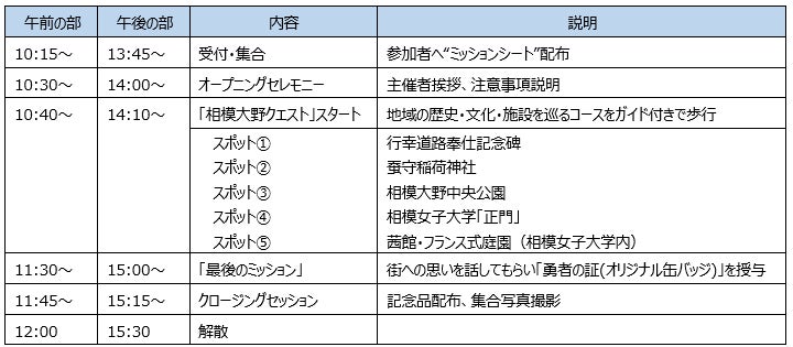 参加者には相模大野の地域の歴史・文化・施設を巡る “ミッション”を伝え、歩きながら探求するツアー形式で街の魅力を再発見してもらいました。当日は晴天に恵まれ、午前の部8 組19 名、午後の部9 組29 名にご参加いただきました。スポットを巡る地図“ミッションシート”を片手に、全員元気よくスタートし、最後のミッションとしてこの街をどんな街にしたいかを話してもらい、街の未来に思いを寄せてもらいました。本イベントの特徴は以下の通りです。