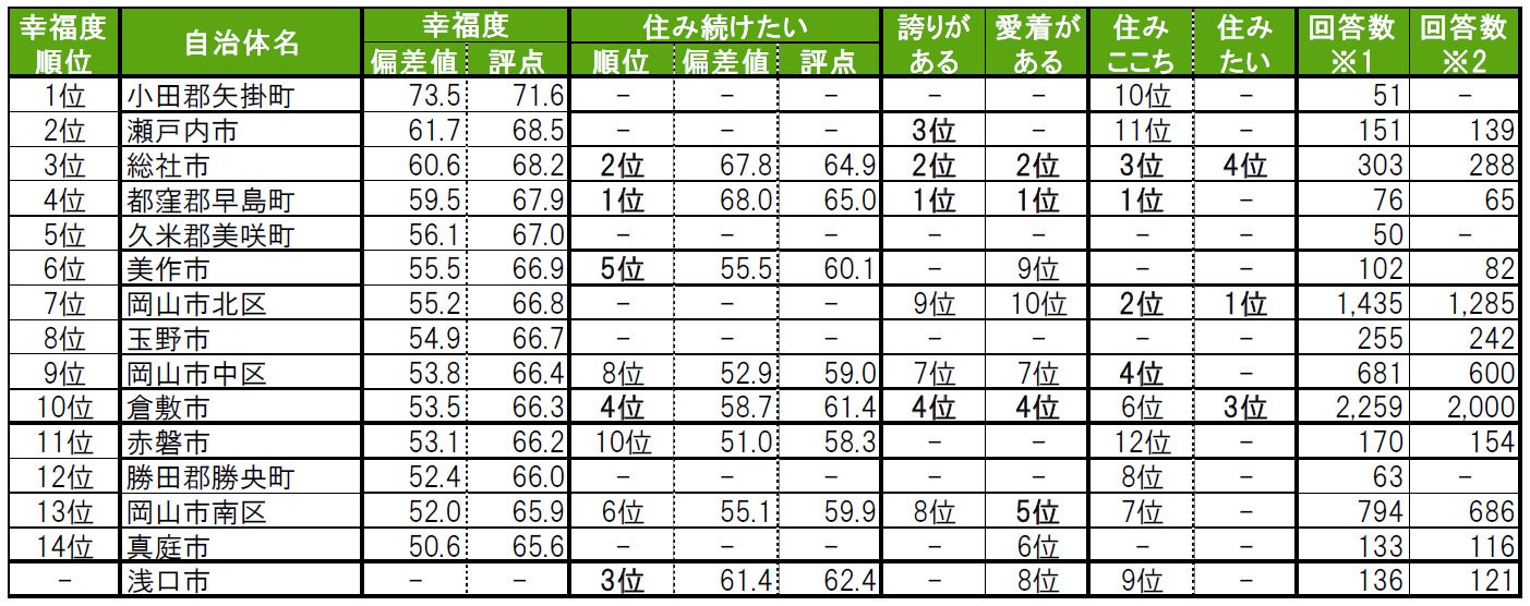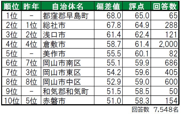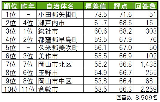 1位は小田郡矢掛町で、昨年は累計回答数が50名未満だったためランキング集計対象外だった町、今年は唯一偏差値70台の高い評価で初ランクインとなっています。2位は瀬戸内市で、「街に誇りがある」は3位です。3位は総社市で、「住み続けたい街」「街に誇りがある」「街に愛着がある」2位、「住みここち」3位、「住みたい街」4位と全ランキングで上位に入る高評価を得ています。