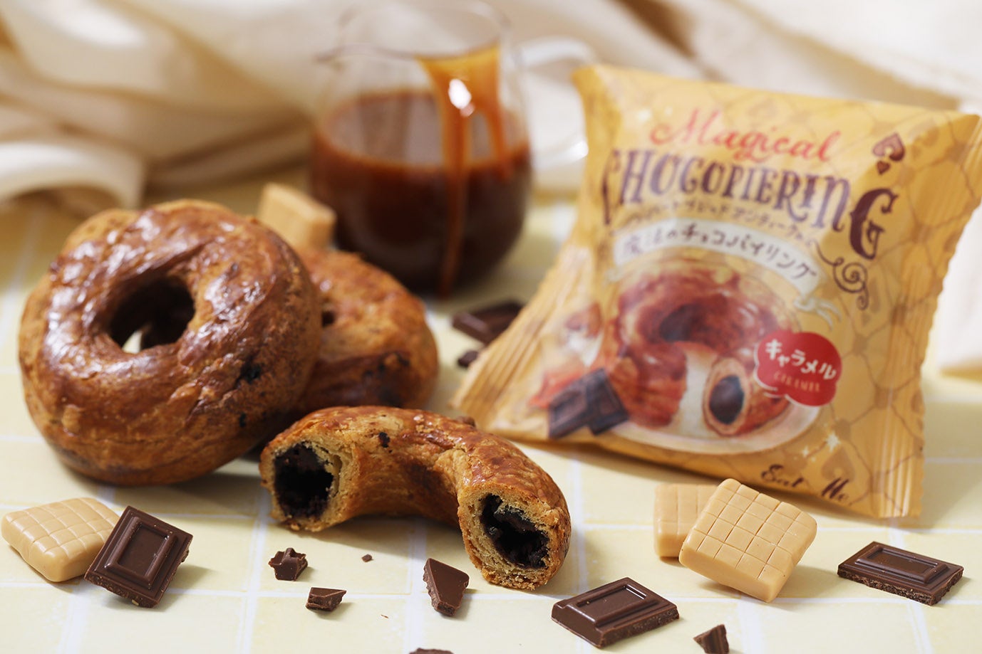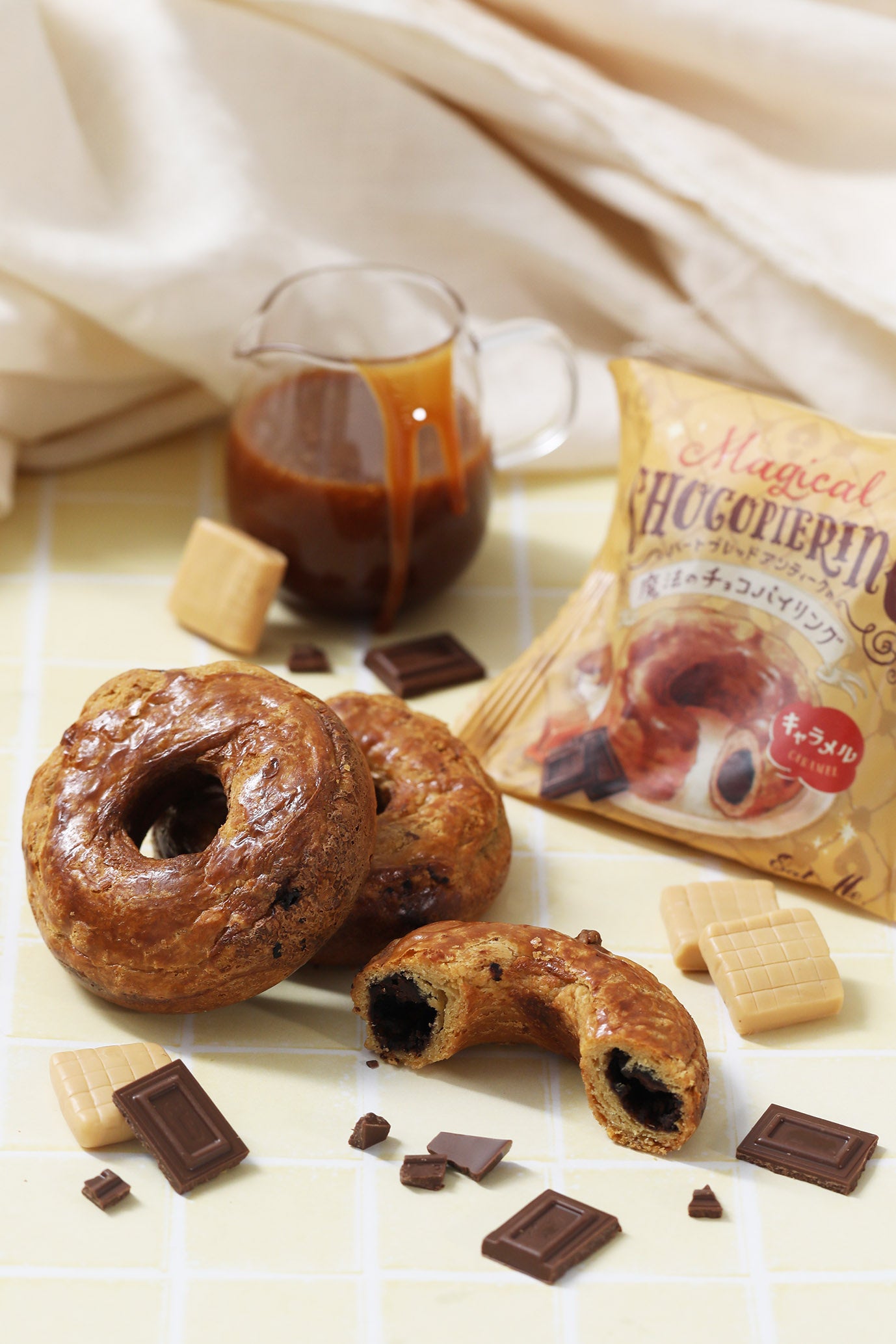「魔法のチョコパイリング キャラメル」は、キャラメルの風味豊かなサクサクしたリング型のパイ⽣地に、キャラメル風味のチョコクリームを包んで焼き上げました。1個で大満足のボリュームも魅力的です。