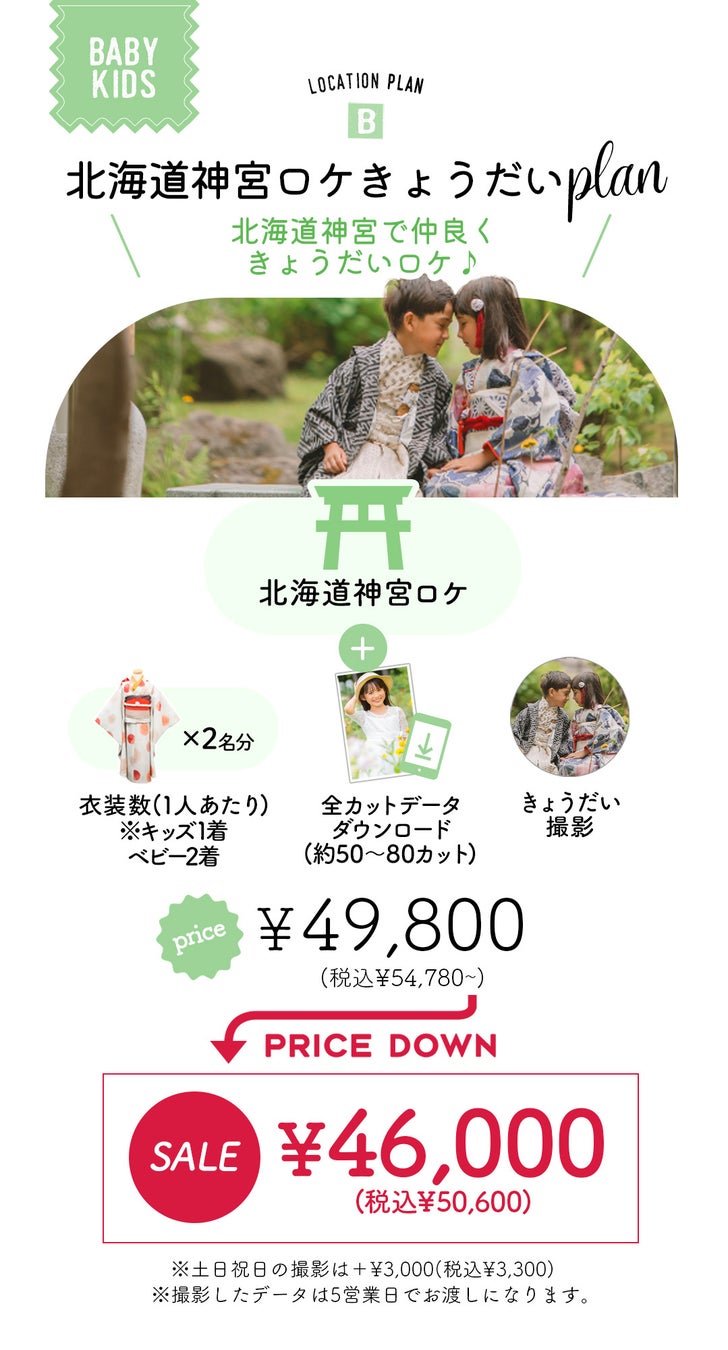 対象プランは一番人気のオリジナルフォトブックがついてくる"ライトプラン"から、この時期人気の北海道神宮で撮影ができるロケーションプランまで幅広くご用意。