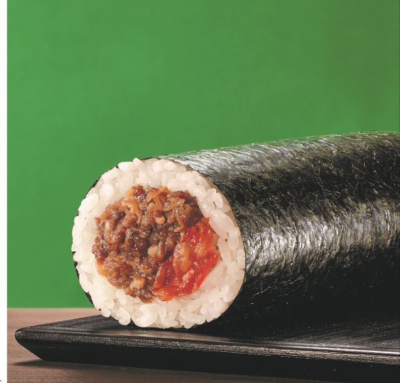 【内容】3種のジャン入り焼肉のたれと絡めたアンガス牛の炭火焼と、ヤンニョンジャンのたれを混ぜ合わせたキムチが入った恵方巻です。肉の旨味、キムチの辛み、たれの深みが味わえます。