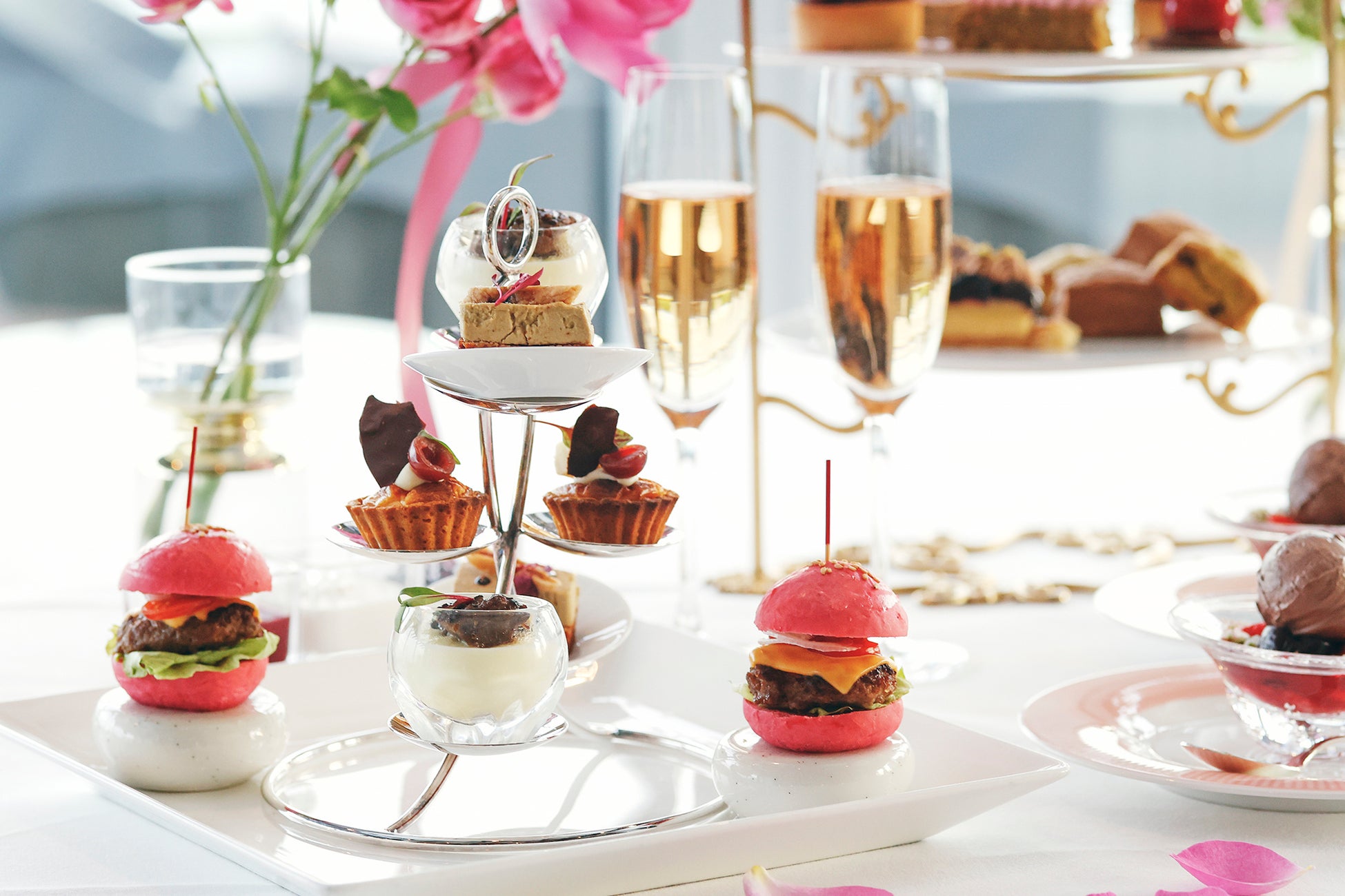 乾杯酒(ロゼスパークリングワイン)、スペシャリテ、プティ・ガトー、スコーン、セイボリー、ドリンク28種