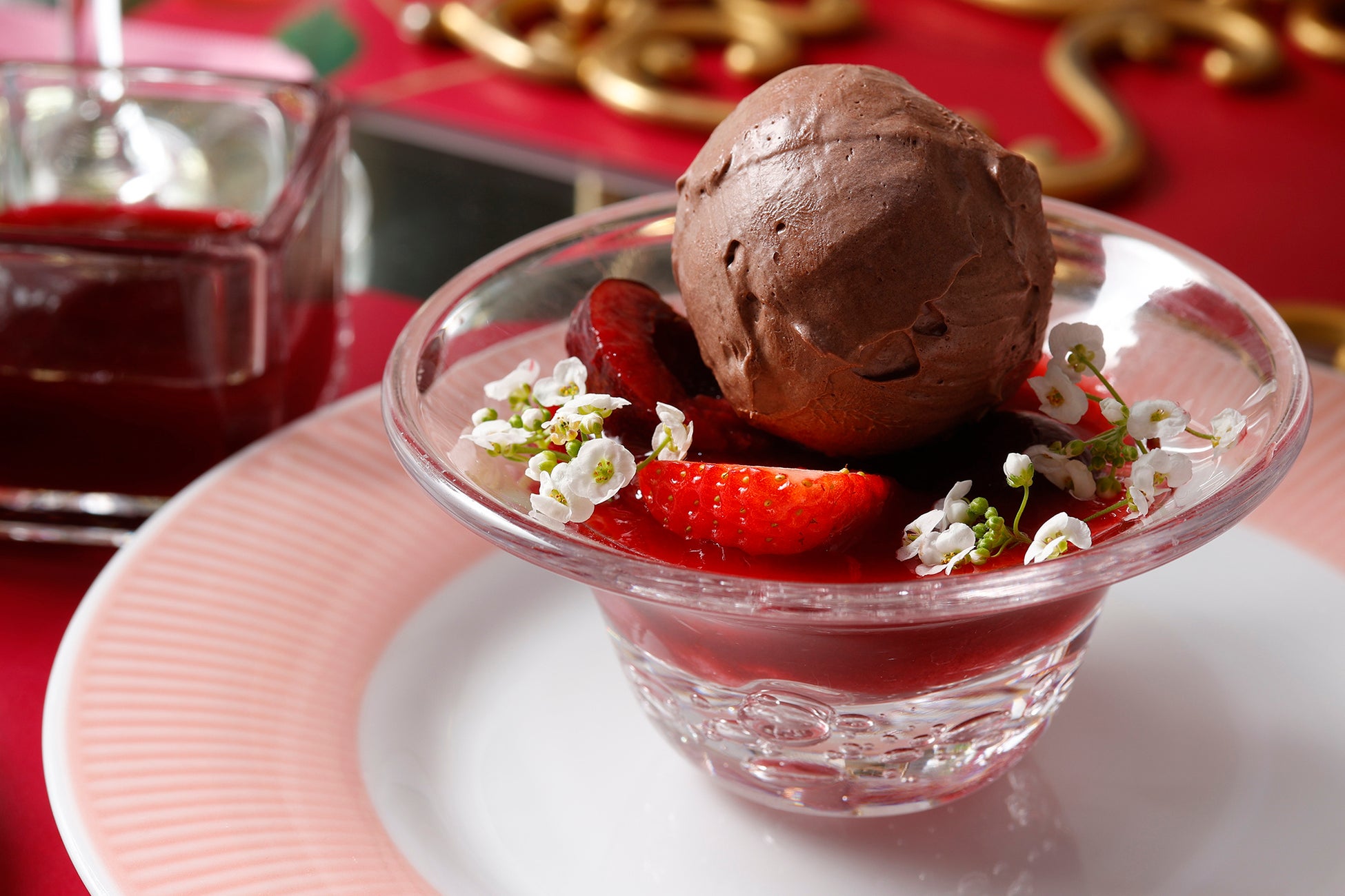 スペシャルディッシュには、今回のコラボレーションを象徴するアメリカンチェリーといちごのフレッシュな味わいとホテルメイドのリンツチョコレートアイスクリームの濃厚な甘みのマリアージュを堪能いただける「チョコレートチェリーセンセーション」をご用意いたしました。