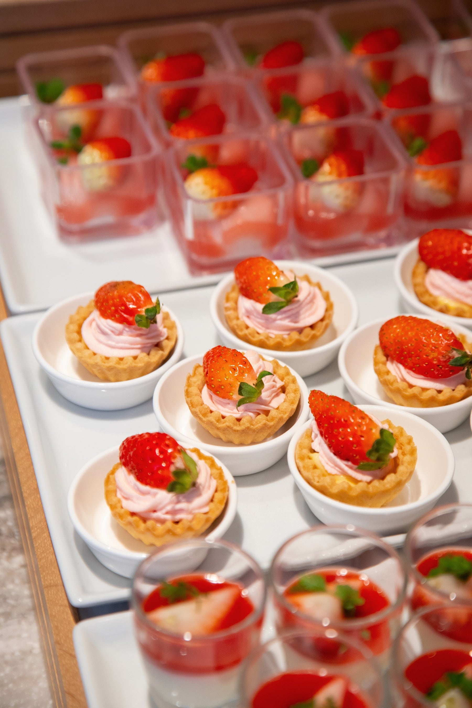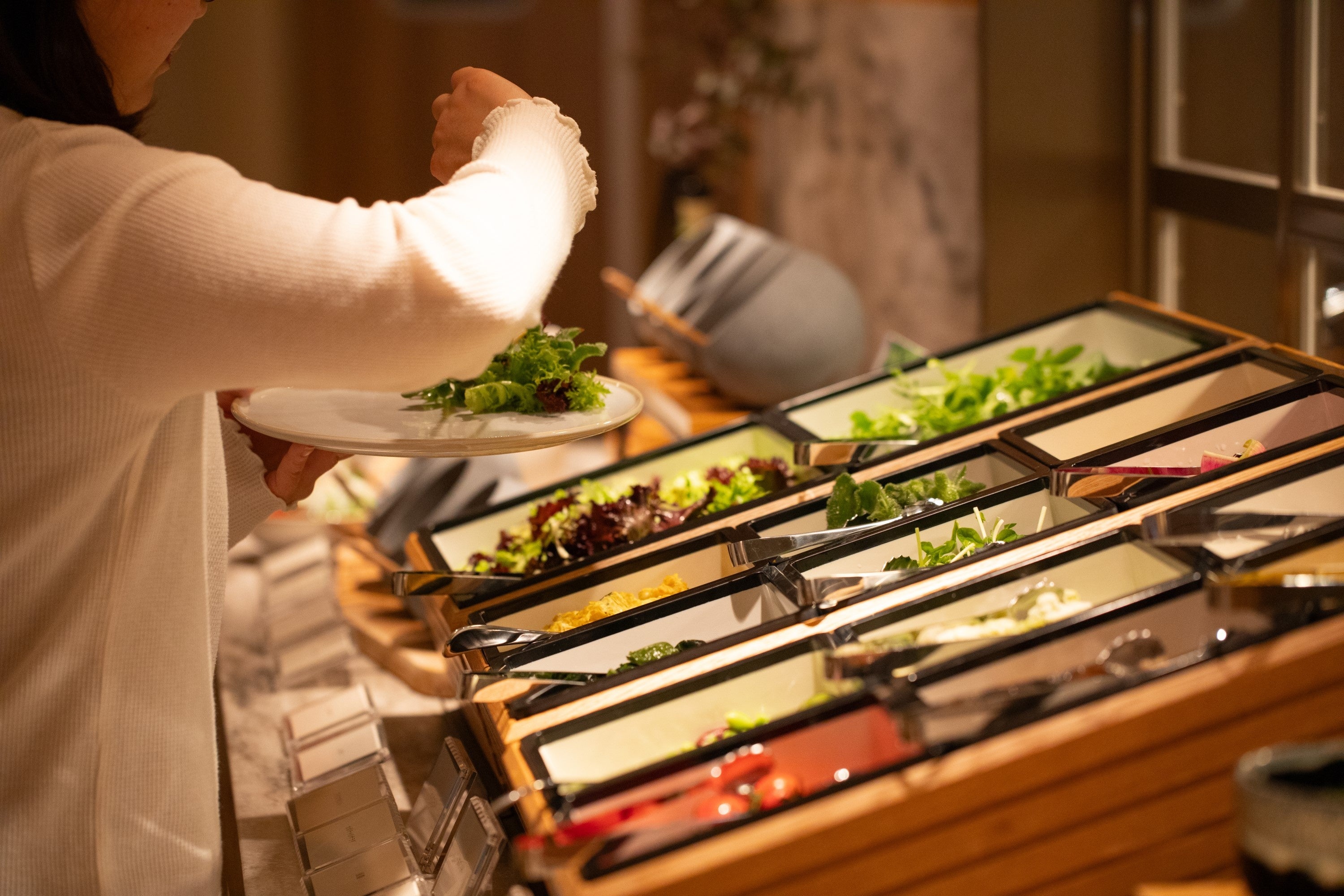 サラダブッフェバーの付け合わせは約 12 種類、ロマネスコやアイスプラントをはじめ、茄子のマリネやかぼちゃサラダ等が美しく並びます。温かい料理では、春キャベツと桜エビを使用したペンネ、筍と菜の花のアンチョビ炒めなど季節の食材を使用したメニューに加え、唐揚げやポテトフライなどお子様にも人気のメニューが揃います。唐揚げには、油淋鶏ソースとタルタルソースの 2 種からお好みのものをお選びいただけます。お食事のラストを飾るデザートコーナーには、キャラメル・ベリー・ホワイトチョコの 3 種のソースを選べるワッフルや苺のスイーツ、果実の爽やかなシャーベットのほか、当館自慢の少し硬めの「レトロプリン」と、なめらかなキャラメルソースが絶品の「なめらかプリン」の 2 種もご用意しています。ぜひ、プリンの食べ比べもお楽しみください。