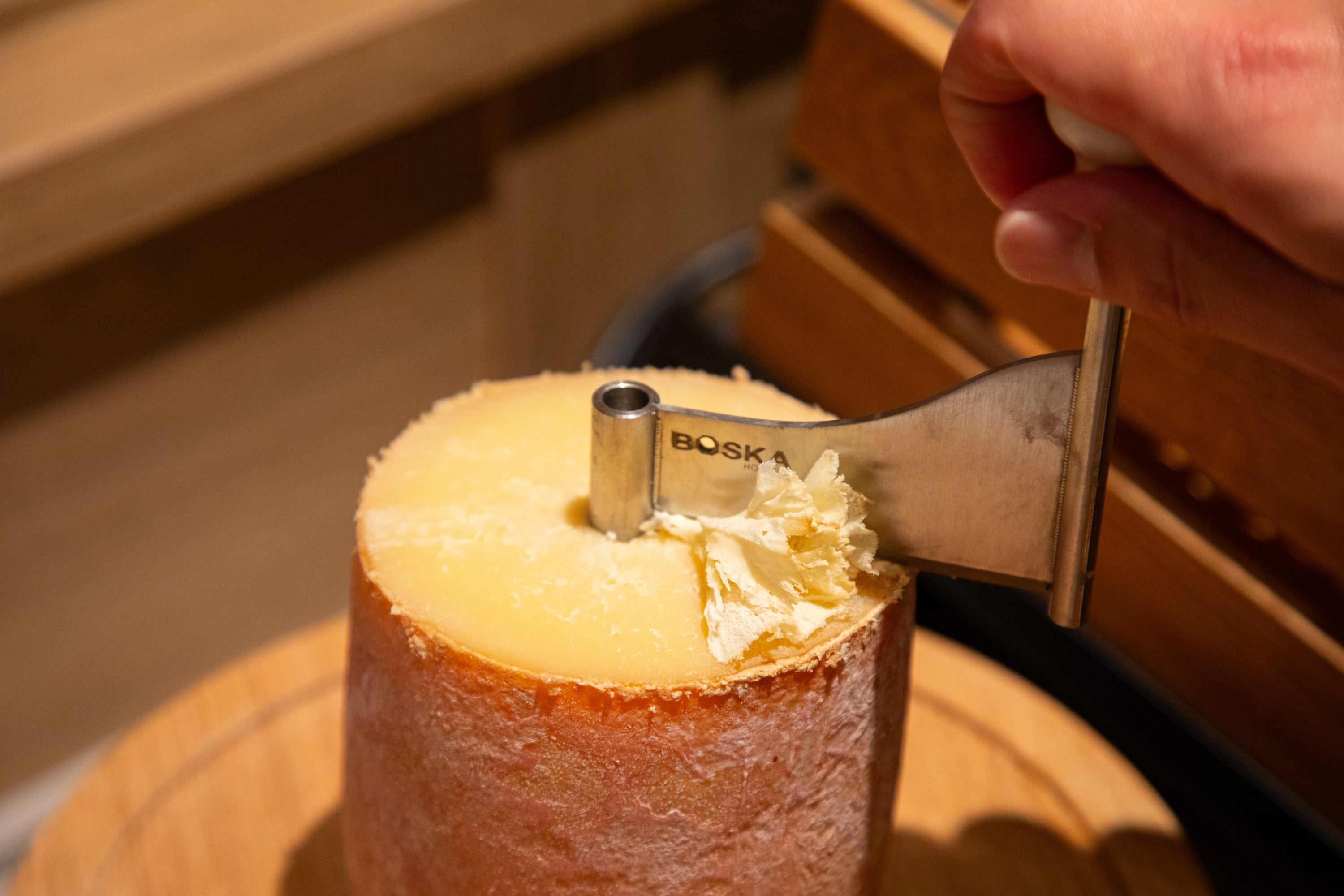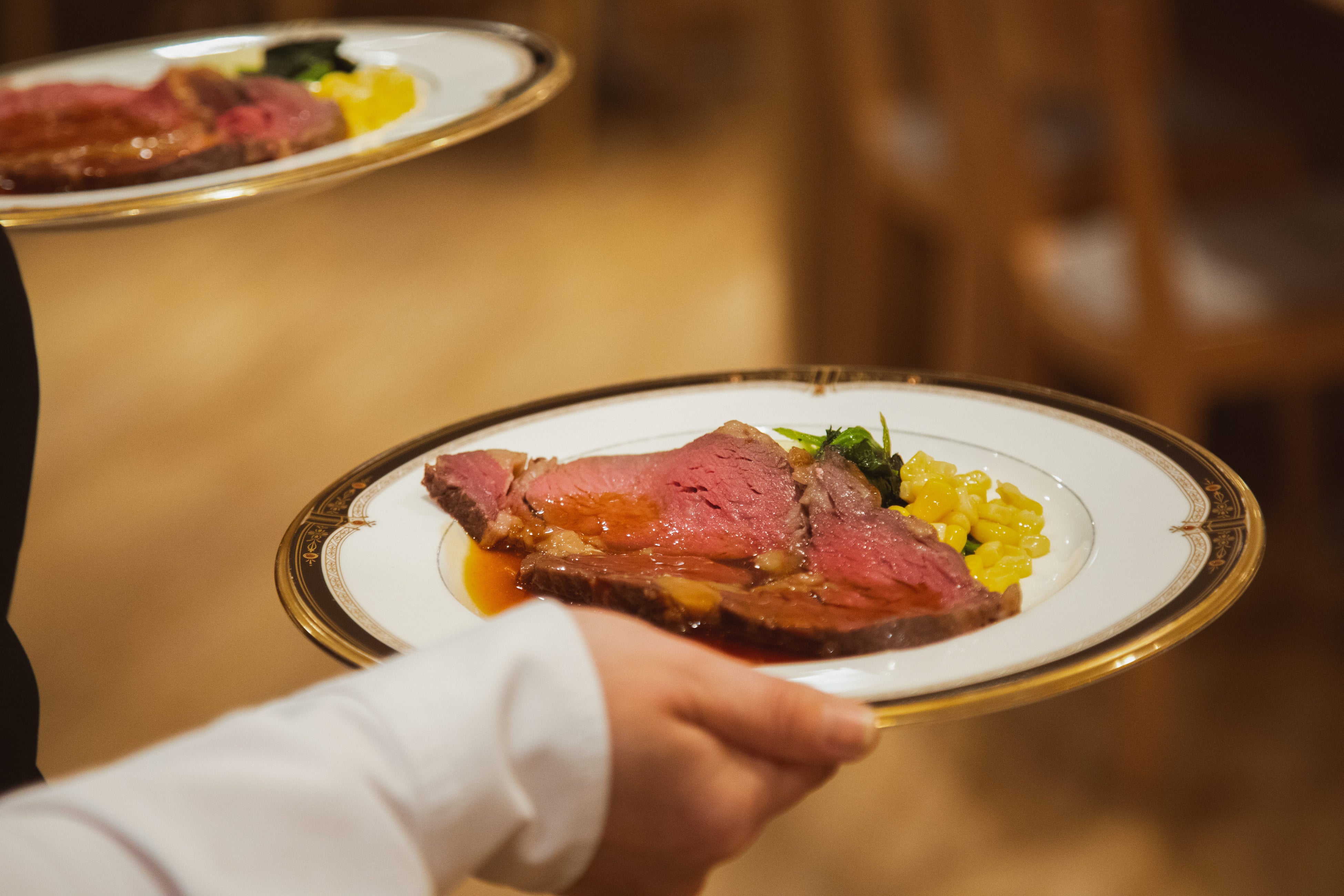 メインディッシュとして提供するのは、リブロースの中でも最上級ランクのプライムリブのローストビーフです。じっくり 5 時間かけ低温調理しているため、お肉はとても柔らかく、噛むごとに肉汁が溢れ出てきます。しっかりとお肉を食べたという満足感を味わっていただけるよう、ローストビーフは一皿につき 80g、ソースには旨味が凝縮したグレービーソースを使用し、マッシュポテト、ほうれん草、コーンを添えます。さらに、別添えのレフォール(西洋わさび)や粒マスタードは、味にアクセントをつけてお楽しみいただけます。