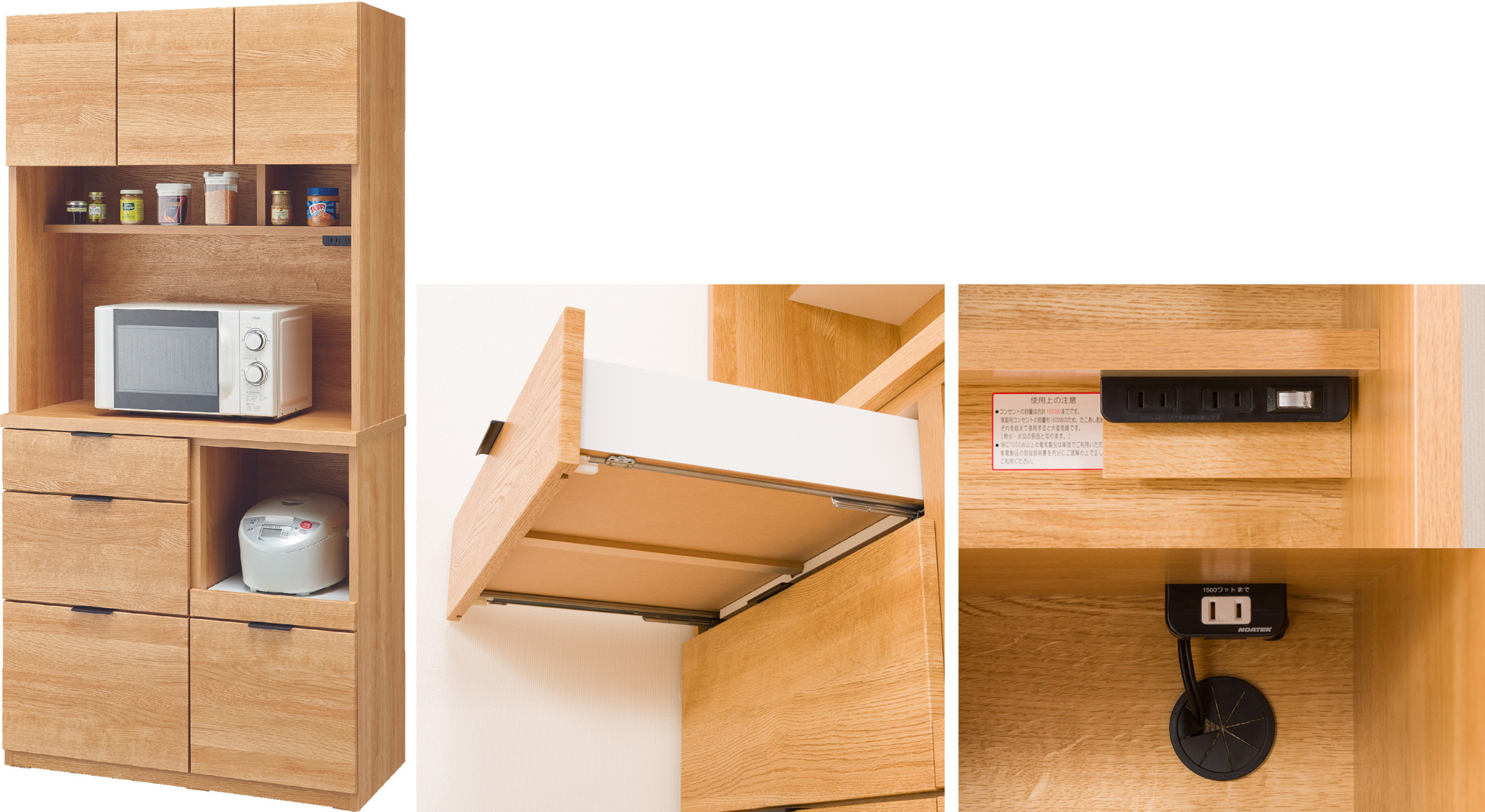 使い勝手の良さはもちろん、引出しが劣化しにくく長くお使いいただくことができます。上台に2口、下台に1口それぞれコンセント口があるので家電が多いご家庭でも使いやすいです。