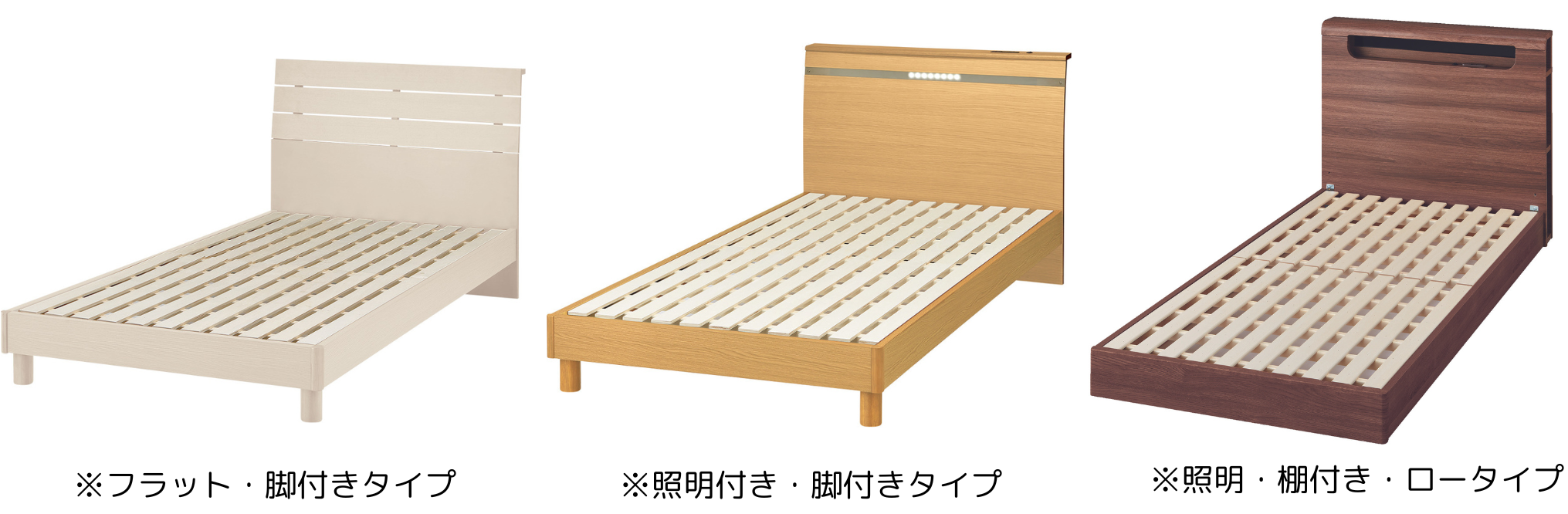 本体は脚を外してロータイプにすることも可能です。一人ひとりの好みやお部屋に合う「選べるフレーム」です。サイズバリエーションもシングルサイズからクイーンサイズまで展開しています。