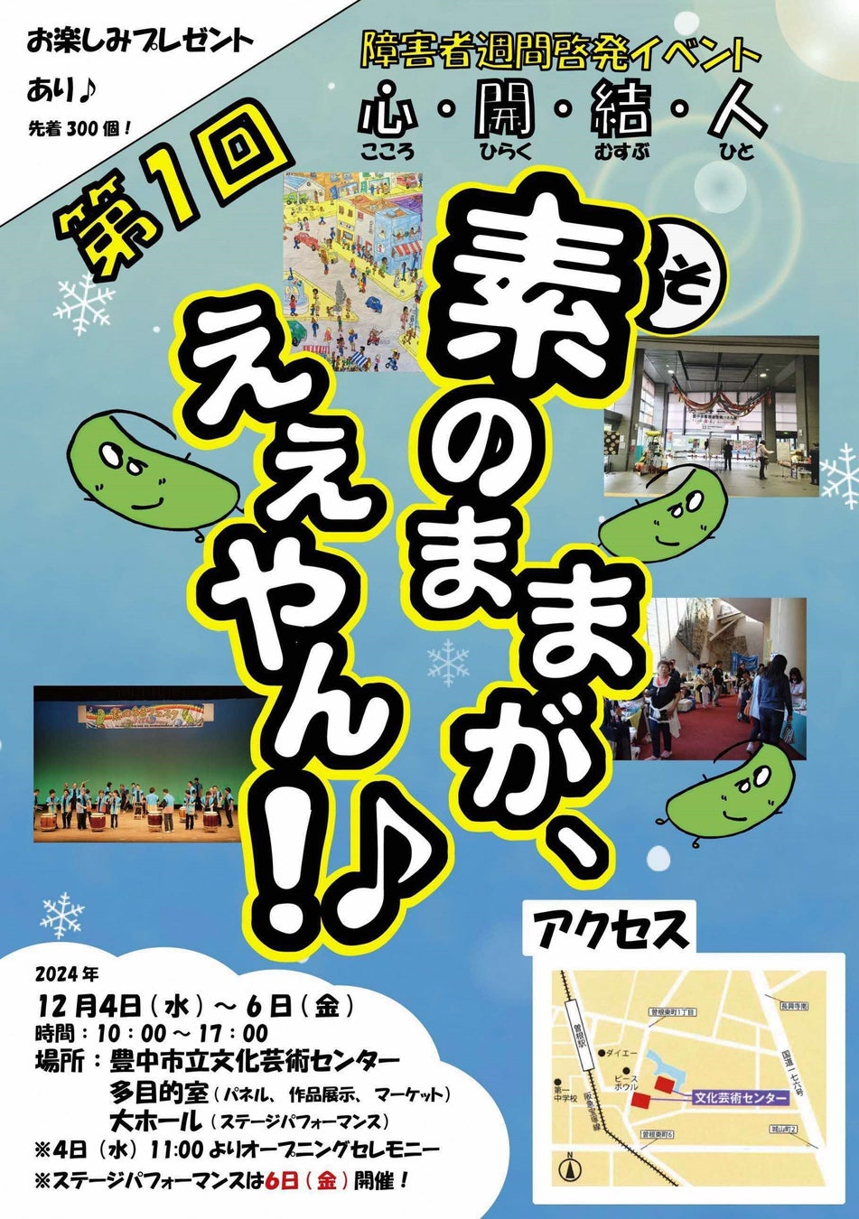 豊中市は、障害者週間(12月3日~12月9日)に合わせ、文化芸術センターでイエロー・ライトアップと啓発イベント「素のままが、ええやん!♪」を実施します。今回から「心(こころ)・開(ひらく)・結(むすぶ)・人(ひと)」をキャッチフレーズに、これまで別々に実施していた素のままフェスタや作品展示などの啓発イベントを一体化します。授産製品の販売やアート展示、歌やダンスステージなど、障害のある人の活動紹介を通じて、障害のある人もない人も共に集い、出会い、考えることで相互理解を深める機会とします。