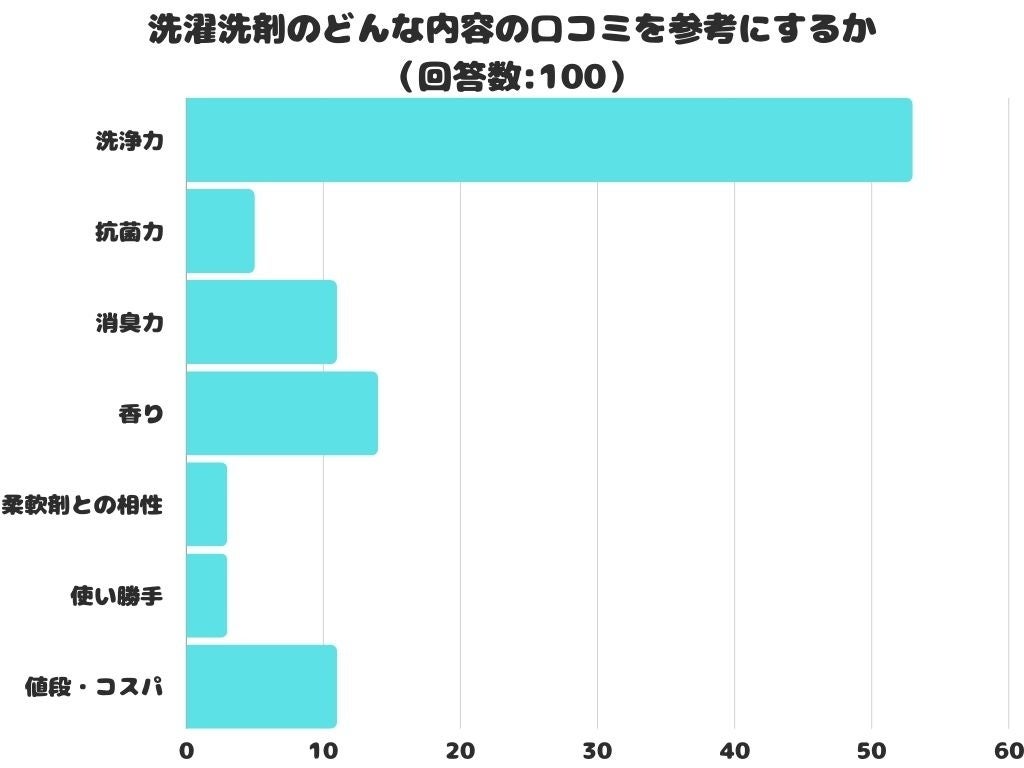 洗濯洗剤のどんな内容の口コミを参考にするかをアンケートにて調査したところ、1位は「洗浄力」でした。