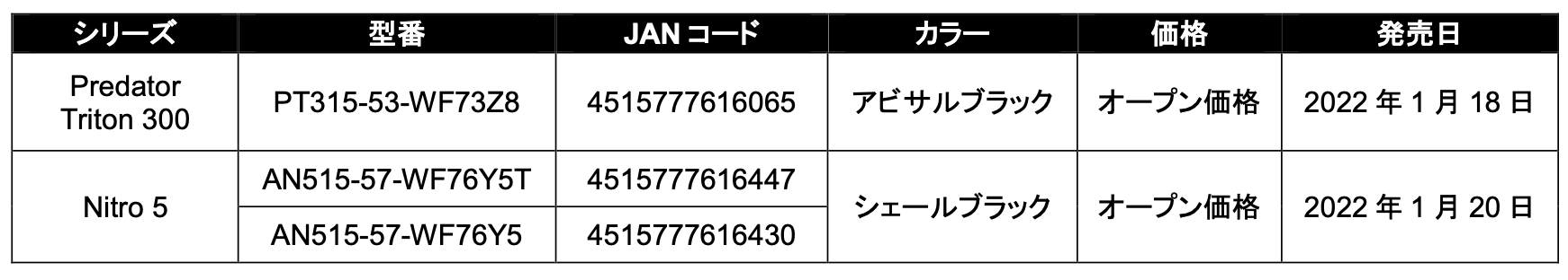 日本エイサー株式会社(本社:東京都新宿区、代表取締役社長:ボブ・セン)は、コアなゲーマーに向けた最上位ゲーミングブランドPredator(プレデター)よりゲーミングノートパソコン 、Predator Triton 300の新モデル「PT315-53-WF73Z8」の発売日を2022年1月18日(火)に、さらに、カジュアルゲーマーからコアゲーマーまで幅広いゲーマーに向けたゲーミングブランドNitro (ニトロ)より、ゲーミングノートパソコン Nitro 5の新モデル「AN515-57-WF76Y5T」「AN515-57-WF76Y5」の2機種を2022年1月20日(木)に発売することを決定しました。