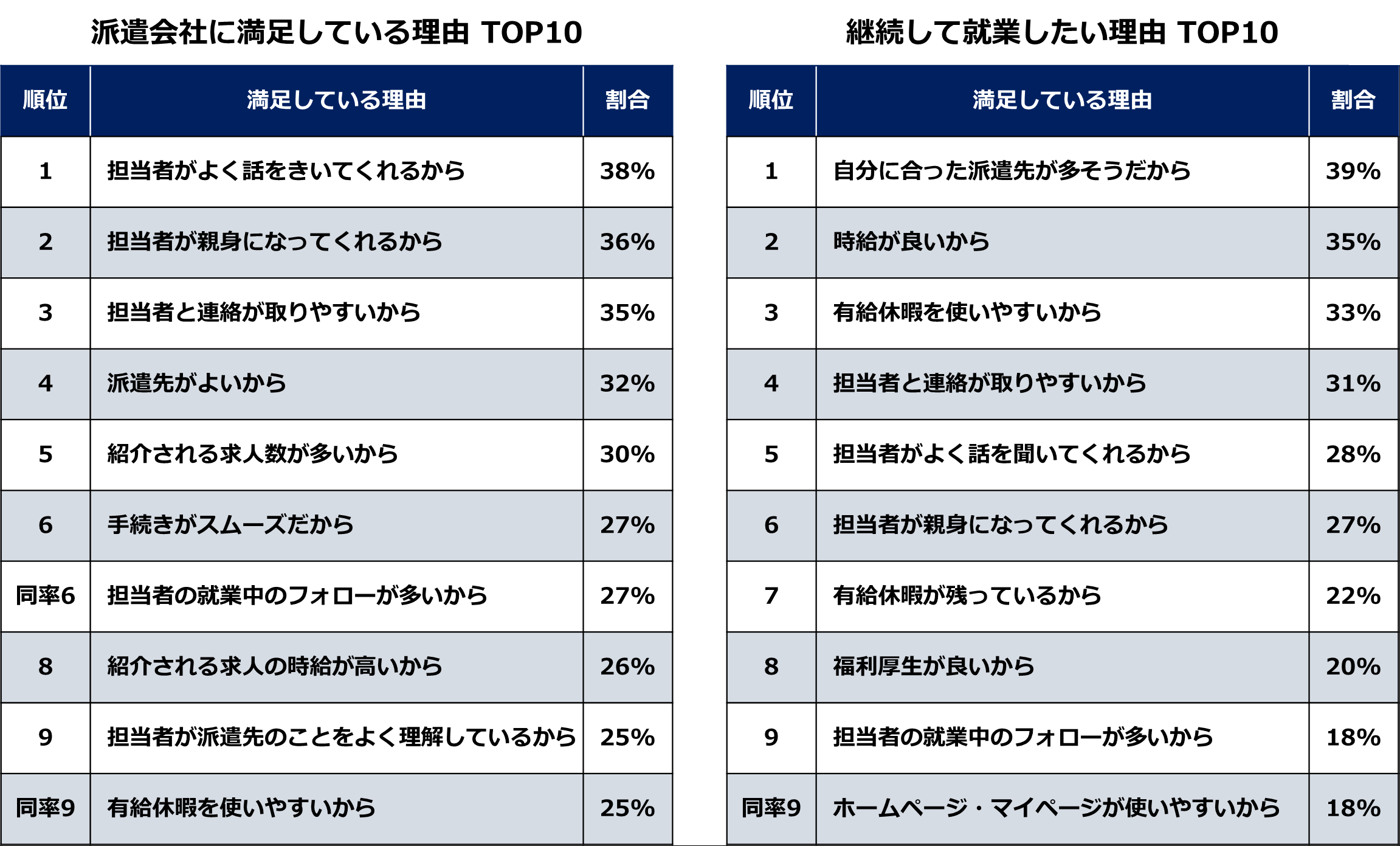 「派遣会社に満足している理由」と「継続して就業したい理由」を聞くと、トップ10は以下になりました。満足度ランキング、継続就業意向度ランキングの上位に挙がった派遣会社は、これらのポイントが平均を上回る傾向にあります。各社のスコアの詳細は、ランキング詳細をご覧ください。