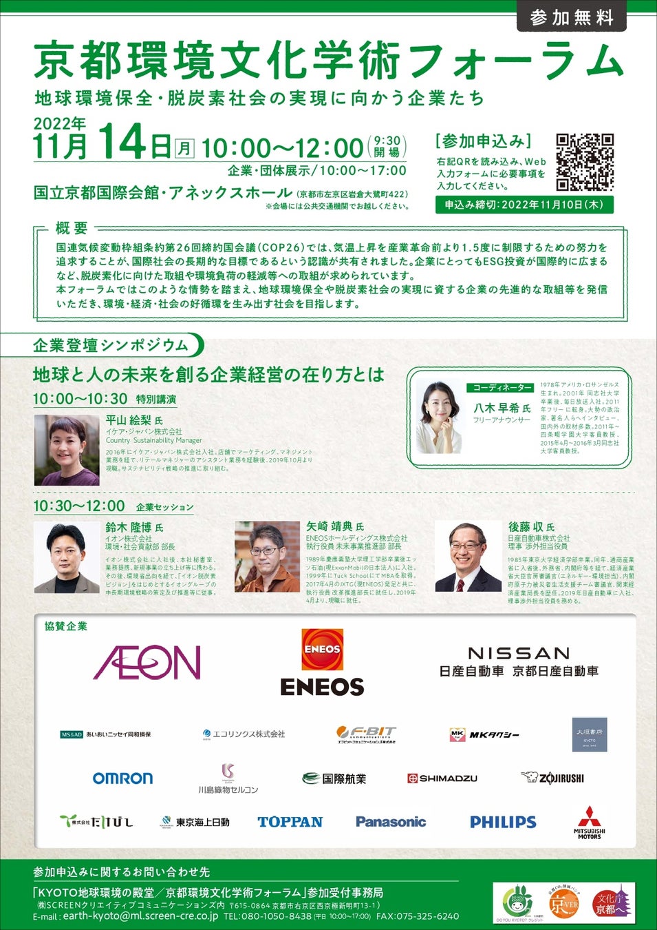 企業とともに地球と人の未来を考えよう!11月14日(月)「京都環境文化学術フォーラム」にてシンポジウム・ブース展示を実施します