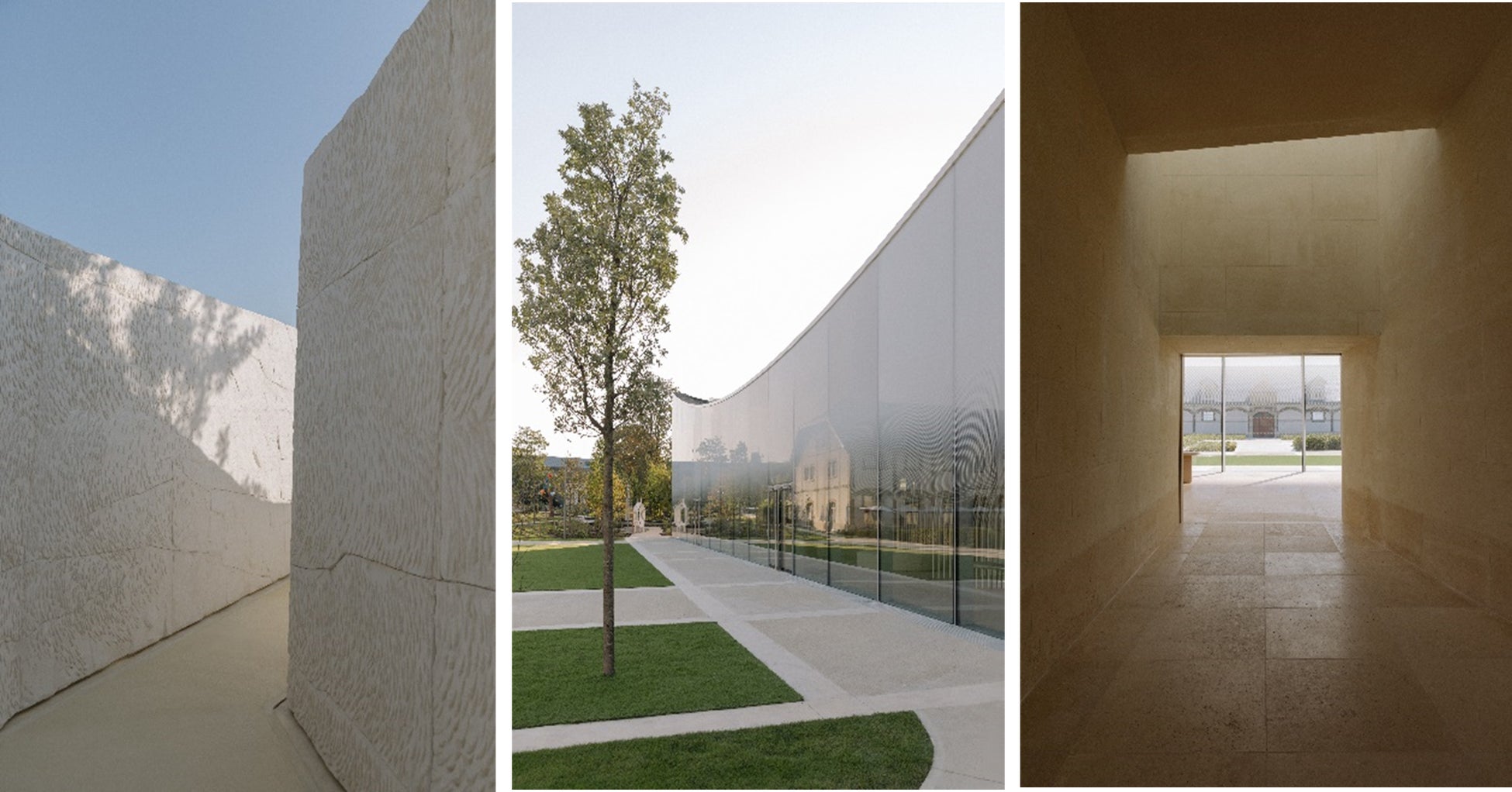 建築家の藤本壮介氏は、新たなパビリオンをいくつかのシークエンスに分けて空間をデザインしました。建物の顔となるエントランスホールは、クレイエルから伸びる小道の陰りと、ブドウ畑を養う陽光の コントラストをより一層際立たせています。天然色のベージュの壁に囲まれた広大な光のシャフトを通り抜けると、訪問者は絵画のように中庭の景色を縁取る巨大な出窓に直面します。庭に面する正面の壁をガラス張りにすることで、光によって彫刻された空間を演出しています。透明から霞がかった色合いへ徐々に変化していくガラスは、シャンパーニュから立ち上る泡を連想させ、メゾンの歴史を語る上で欠くことができない特別な場所を、時代を超越したイメージへと昇華させています。
