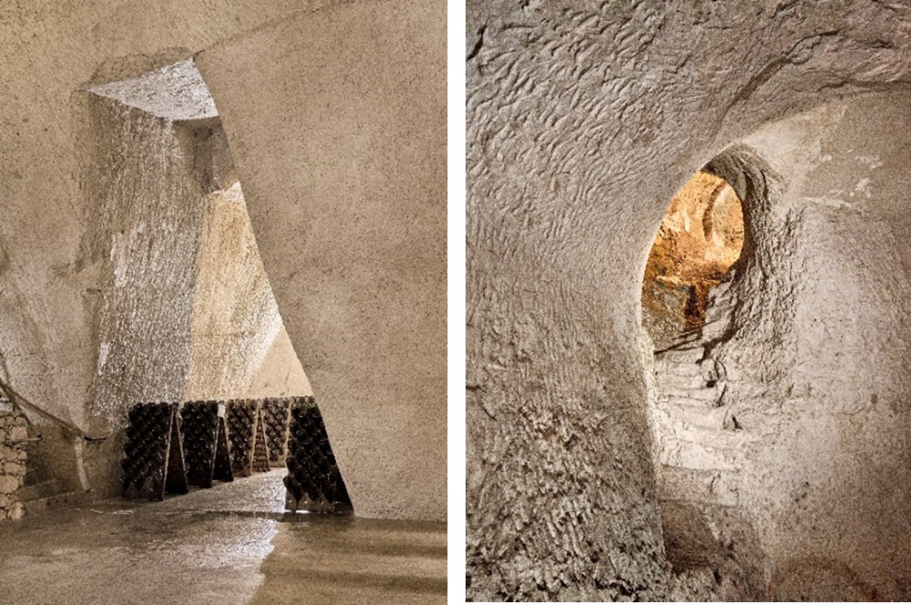 2015年、メゾン ルイナールの畑、丘陵、そしてセラーがユネスコの世界遺産に登録されました。ルイナール家は、19世紀にランスの高台にある2.9ヘクタールの土地を取得。この敷地の最大の特徴は、3層にわたって石灰層に掘られたギャラリーのある地下のレイアウトです。13世紀に掘削された地下回廊は、ランス市周辺の城壁建設に必要な白亜石灰岩を採取するために数世紀にわたって使用された歴史を有し、後にギャラリーとして整備され一般開放されています。「4 RUE DES CRAYÈRES」は、数千年の歴史を持つ白亜のセラーや指定森林地帯そしてワイン醸造など、ランスの地の特徴を集約させたものと言えるでしょう。木製の屋根を載せたこのパビリオンは、持続可能な世界に対するルイナールのコミットメントも体現。環境配慮の観点から、建物の壁や骨組みには地元で厳選された自然素材やバイオ素材を使用しています。雨水利用や緑化屋根の採用、強化断熱材やUVカットガラスを使用するなど、本プロジェクトはフランスの建築基準「HQE(High Quality Environmental)」の基準をすべて満たしています。さらに、敷地全体に地熱エネルギーとソーラーパネルを配置することで、エネルギーの80%を自給自足。革新性と環境に対する深い配慮も兼ね備えています。地元のソワソン石を使用した新パビリオンのオープンには、多くの地元の職人も参画。「Entreprise du Patrimoine Vivant(生きた遺産企業)」の称号を授与されている、ランスの熟練した石工であるレオン・ノエル氏は、採石から設置まで技術面における様々なフェーズで、多大な貢献を果たしました。