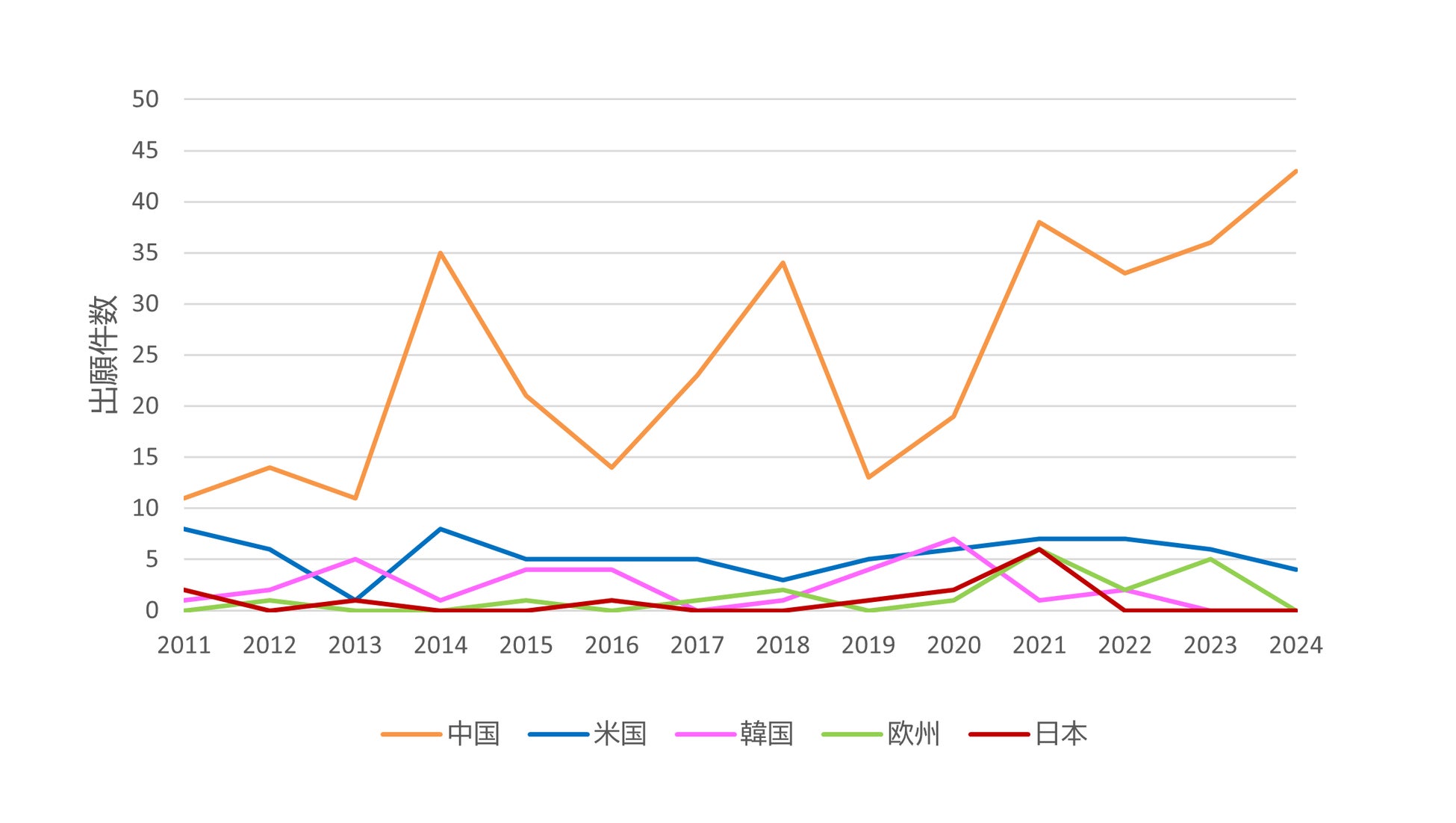 国別では中国の出願件数がもっとも多く、長期的な増加傾向がみられます。そのあとに、米国、韓国、欧州、日本がつづいています。中国では、五カ年計画で有人宇宙飛行および月探査事業が国家科学技術重大特定プロジェクト(国家科技重大専項)に指定され、継続的な事業展開が進んでいます。こうした方針により、孤立環境用の原子力電池といった高出力電源の技術開発に注力していると推測されます。中国の特許出願件数お2~3年周期での増減は、五カ年計画の中間評価や予算サイクルの間隔を反映している可能性があります。