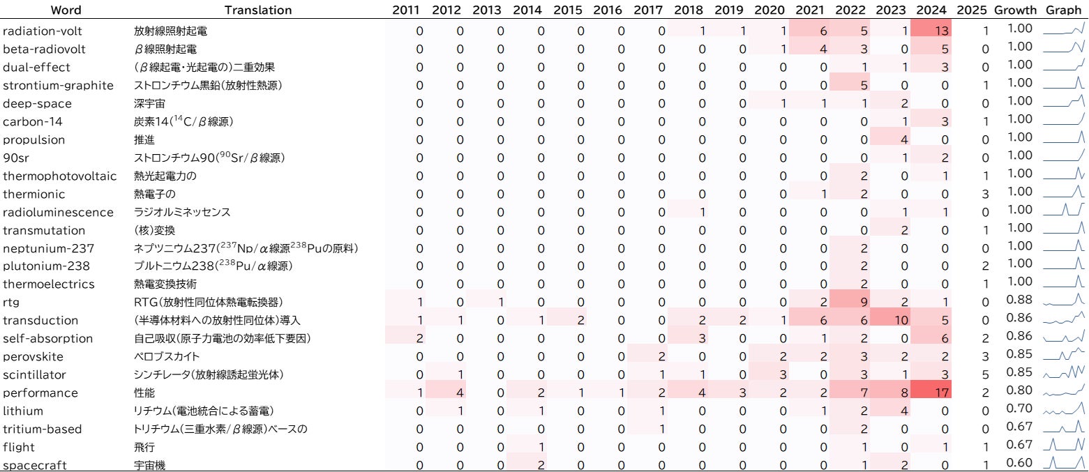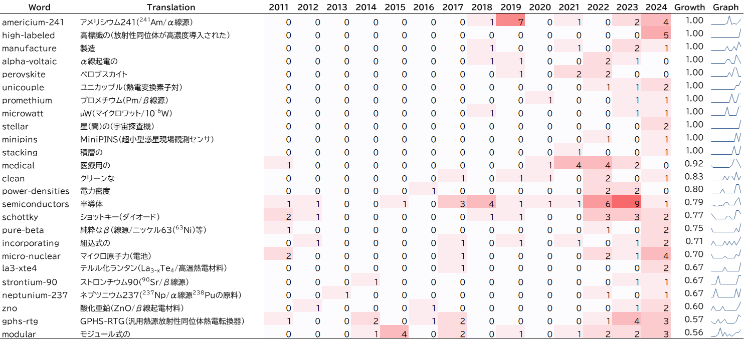 また、原子力電池の小型高出力化に関連する「stacking(積層)」「power-densities(電力密度)」などのキーワードも増加しており、特許分析の結果ともあわせると、放射線の直接電気変換にもとづく原子力電池の技術開発が活発化している傾向がうかがえます。