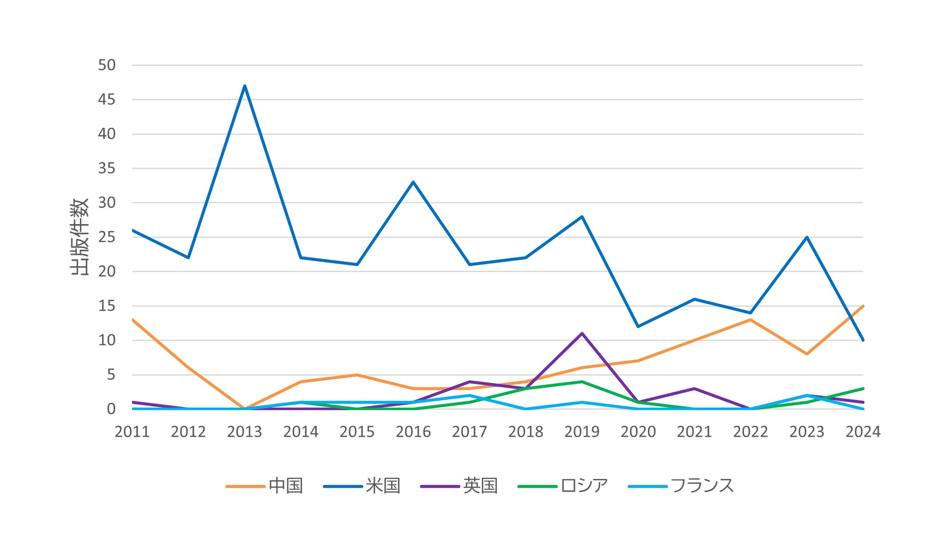 論文出版件数では米国が全体ではもっとも多くなっています。つづいて近年件数をのばしつづけて2024年には米国を上回った中国、その他には英国、ロシア、フランスが続いています。