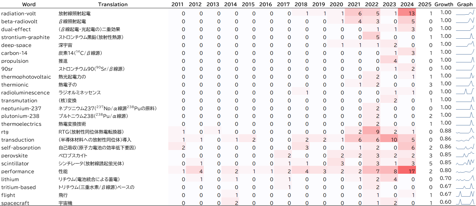 「radiation-volt(放射線照射起電)」「beta-radiovolt(β線照射起電)」「dual-effect(β線と光による二重起電効果)」など、放射性同位体由来の放射線を起電力に直接変換する技術に関連する語が、頻出しています。放射線耐性やエネルギー変換効率の高いワイドバンドギャップ半導体(ダイアモンド半導体など)や、軽量で柔軟性のあるペロブスカイト半導体などの技術進展を背景に、原子力電池の大幅な小型化と高効率化につながる技術開発が活発化していることを反映しています。